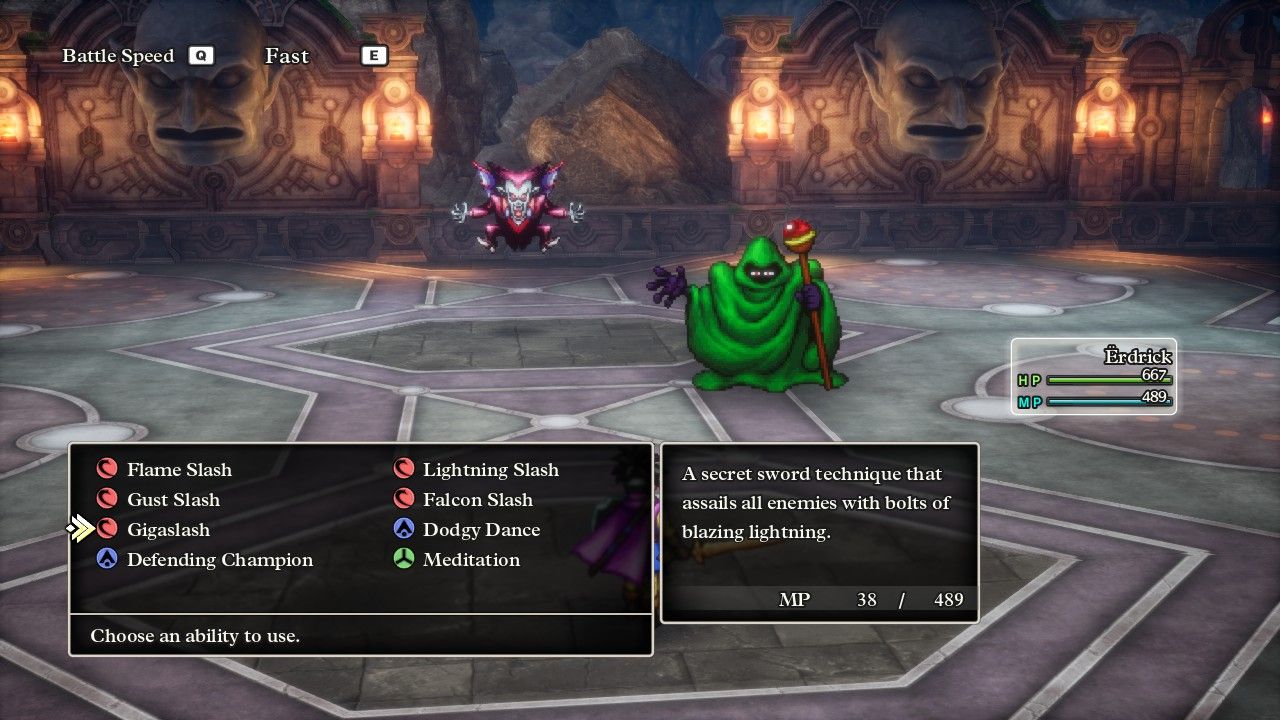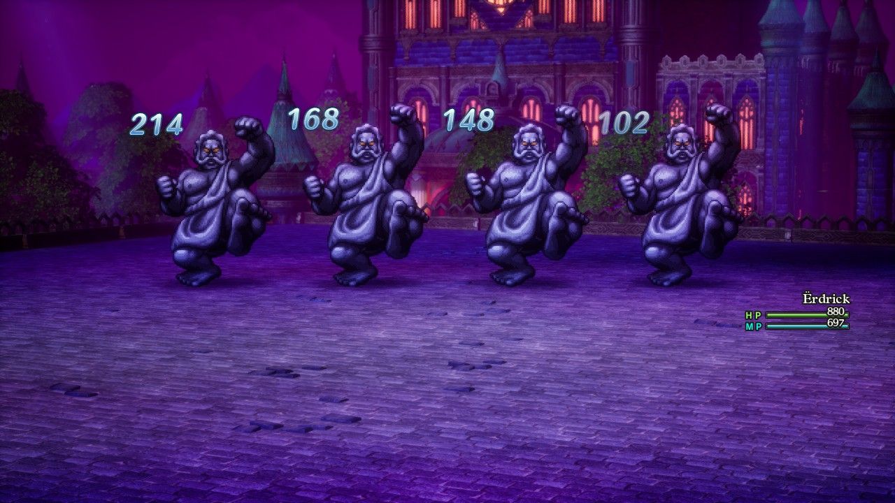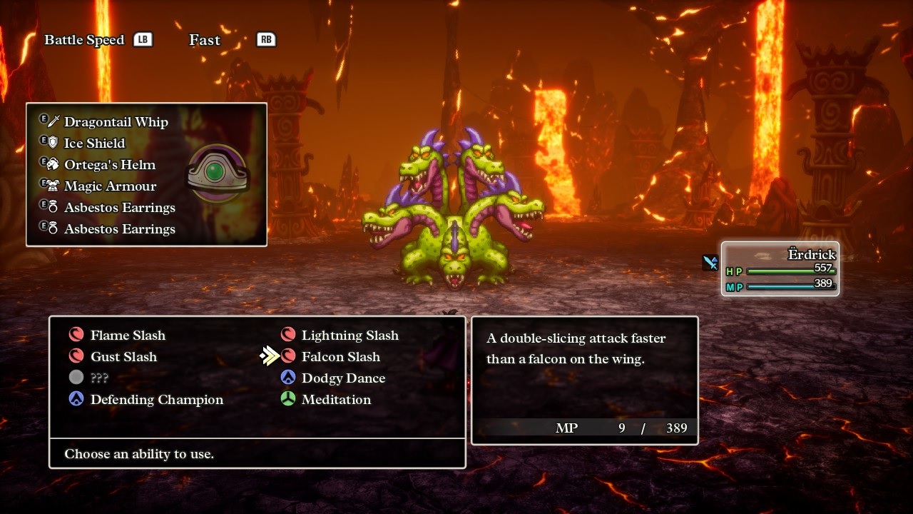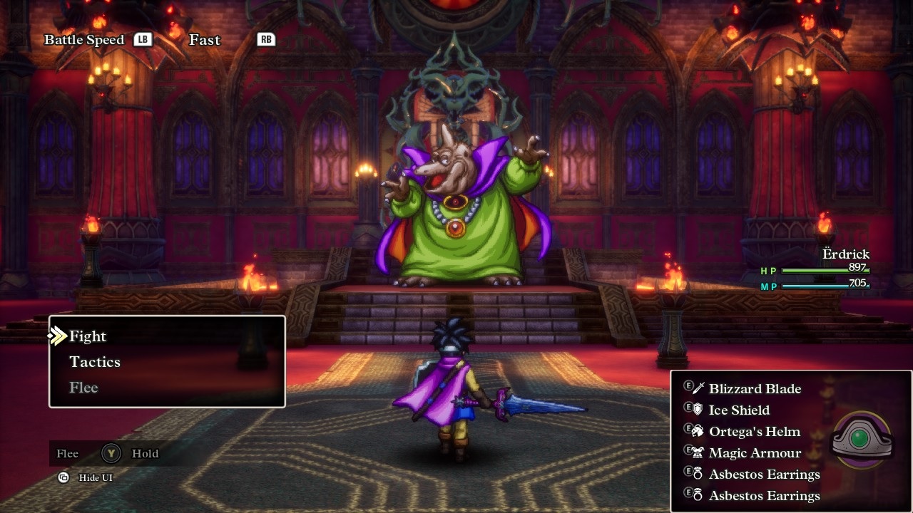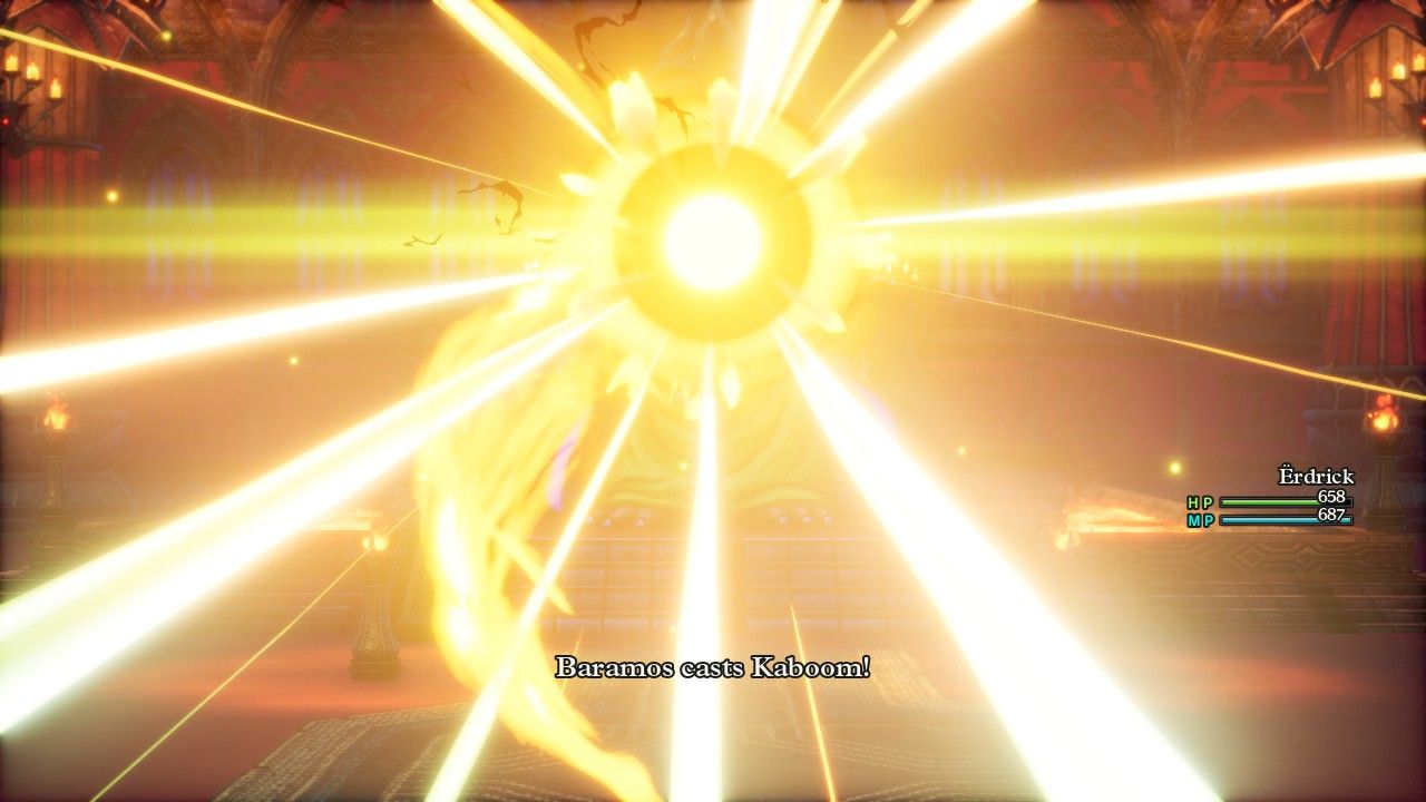 I wasn't planning on taking a screenshot here, but then I saw Erdrick standing there completely alone with the big baddie rising up in front of her, posing and aura farming for all she was worth, and I just had to include this image in the report, heh. Baramos was basically a spellcaster as he didn't attack that often and preferred to toss big area-of-effect spells in Erdrick's direction. He had a couple of status attacks to try with Dazzle and Fuddle, plus an instant death move in Blasto which would end the fight if it landed, then Kaboom (explosion) and Kafrizz (fire) for group damage plus the same Inferno breath attack that I had recently seen from the Garboyle. I thought about equipment options to bring and ended up with something almost identical to what Erdrick used against the Garboyle. She had complete immunity against the fire damage of Kafrizz, 75% damage reduction against the Inferno breath attack, and 33% damage reduction against the explosion spell Kaboom from the Magic Armor. In retrospect, maybe I should have brought the Tempest Shield over the Ice Shield, which would have increased damage from the Baramos' fire attacks but cut the damage from Kaboom accordingly:
