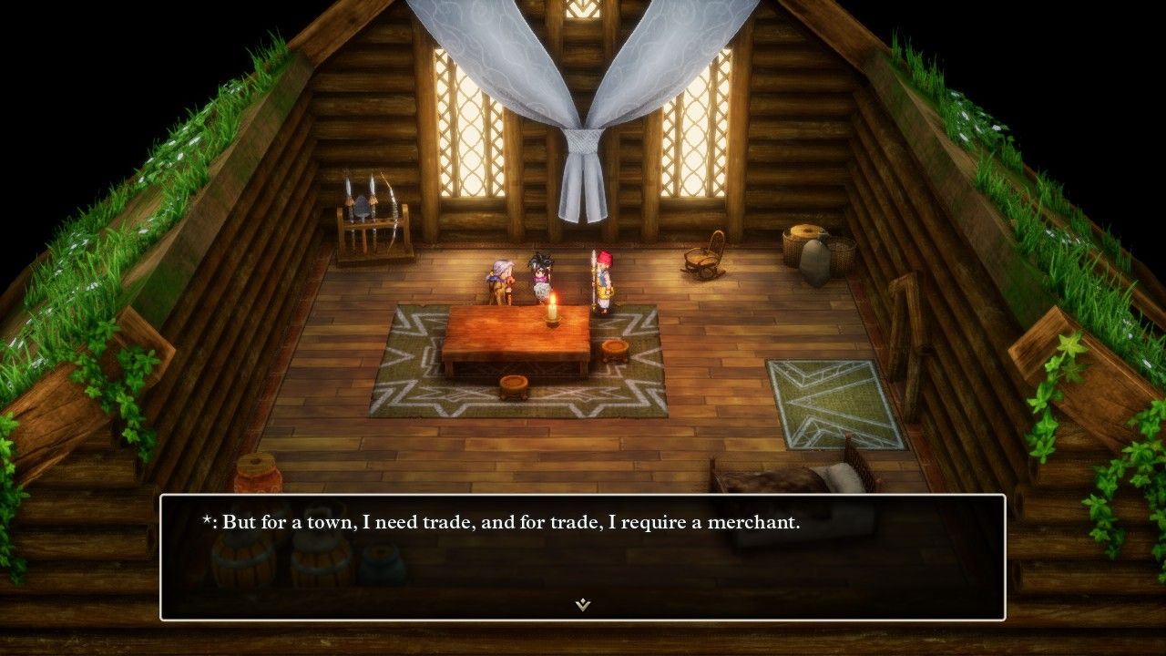 After scouring the Mediterranean clean of its sparkles and secret spots, I made a special side trip over to this world's version of North America. There's exactly one town to be found there, located deep in the interior of the continent near where the headwaters of the Mississippi River would be located. That village was named "Soo" in the NES translation which was a pun on the Sioux people; this, uh, did not age well and it has been rechristened "Persistence" in the HD-2D remake. The village now has a Puritan theme to its characters, and yet it still features teepees and totem poles and other symbols associated with different Native American peoples so this place is a truly incoherent mess now. I traveled here with Erdrick because it had an upgraded boomerang for sale, the Swallowtail, with an additional 28 points of Attack and no elemental properties. This was a noticeable damage upgrade and the Swallowtail would remain Erdrick's default weapon for a long time to come.