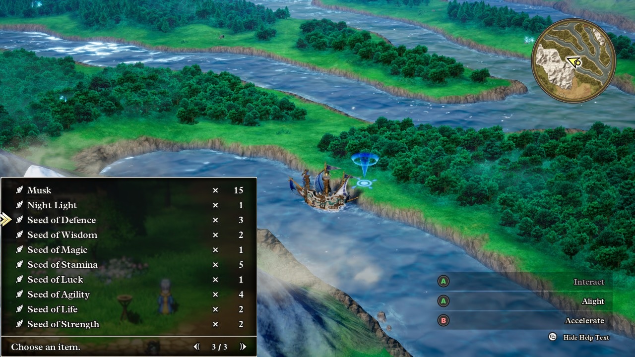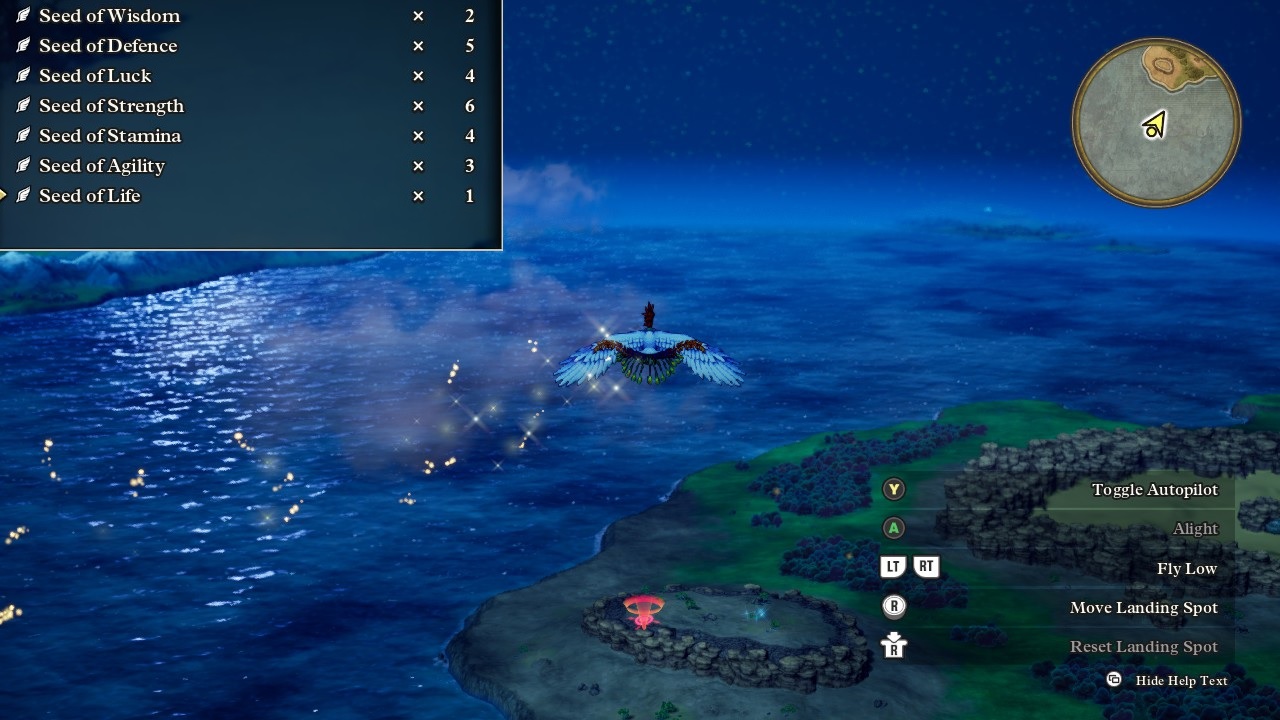 There's a fun cutscene of the crane-like bird awakening and then the party can finally fly for the first time. This was kind of a wasted mechanic in the NES version of the game because the player would get access to Ramia after all this time and effort... only to use it for visiting exactly two places before the overworld was completed. Here in the HD-2D remake, the developers added a whole bunch of mountaintop locations that can only be reached via flight, places that the players has been walking past for the entirety of the game and now finally can access for the first time. There are about 25 sparkle locations and a dozen secret spots tucked away in these places, very much worth the time and effort to track them all down. I pasted in the seed collection that Erdrick amassed purely from these locations, 25 of them in total worth an awful lot of stats after I dedicated about 15 minutes of rerolling them all into max values. One stubborn Seed of Agility failed the 1 in 3 dice roll THIRTEEN times in a row which was a new record for this playthrough, sheesh.