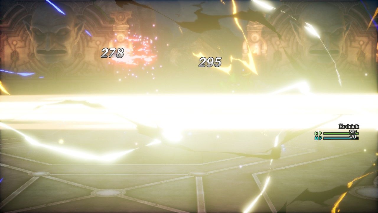 And another screenshot to show the Gigaslash itself. This is a weird ability, with its in-game description stating that it "rains lightning down" on foes but which actually deals physical damage instead. Gigaslash also does not deal damage based on the Attack value of the Hero (such as the elemental slashes that inflict 130% of current Attack value), instead dealing a fixed 300-400 damage to all targets. That's a massive amount of damage under normal conditions, however because it doesn't appear to scale with the Attack value of the Hero, it can be outperformed in the lategame by other options. Erdrick had so much Strength that Falcon Slash was already a clear competitor against single targets, though Gigaslash was better here since it removed the Madvlad minion instantly. It's also a very big deal that Gigaslash does *NOT* double its damage with Oomph Powder (since it doesn't use the Attack stat) which further limits its usefulness. Anyway, despite those limitations the Hero isn't supposed to have this ability until much, much later in the gameplay and these poor enemies didn't really know what hit them.