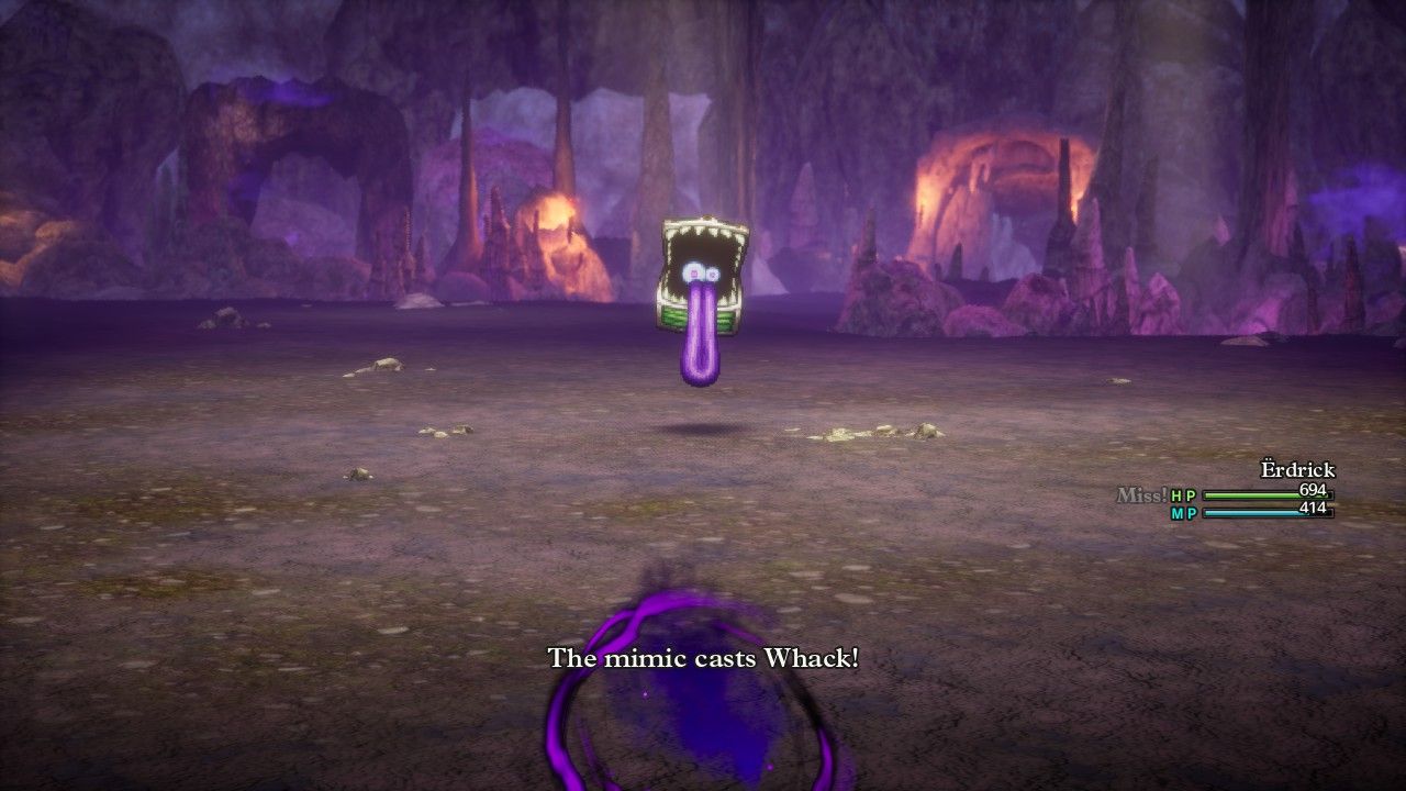 The uncreatively named Manoza Cave dungeon had some impressive XP payouts for winning battles, with Erdrick routinely claiming 3000 and even sometimes 4000 experience per victory. At least these solo characters level really fast in DQ3. This dungeon had lots and lots of treasure chests scattered on the second basement floor, about half of which turned out to be Mimic chests. There's a Mage spell that can reveal whether or not a chest is a Mimic, however Erdrick didn't have access to that knowledge and instead opted to kill everything. The Mimics will spam the instant death spells Whack and Thwack, which Erdrick protected against by having an item called a Diamend in her inventory; the item will shatter and prevent the death effect from taking place. None of these spells ever successfully landed though so either Erdrick was really lucky or there was some kind of hidden protection taking place under the hood.
