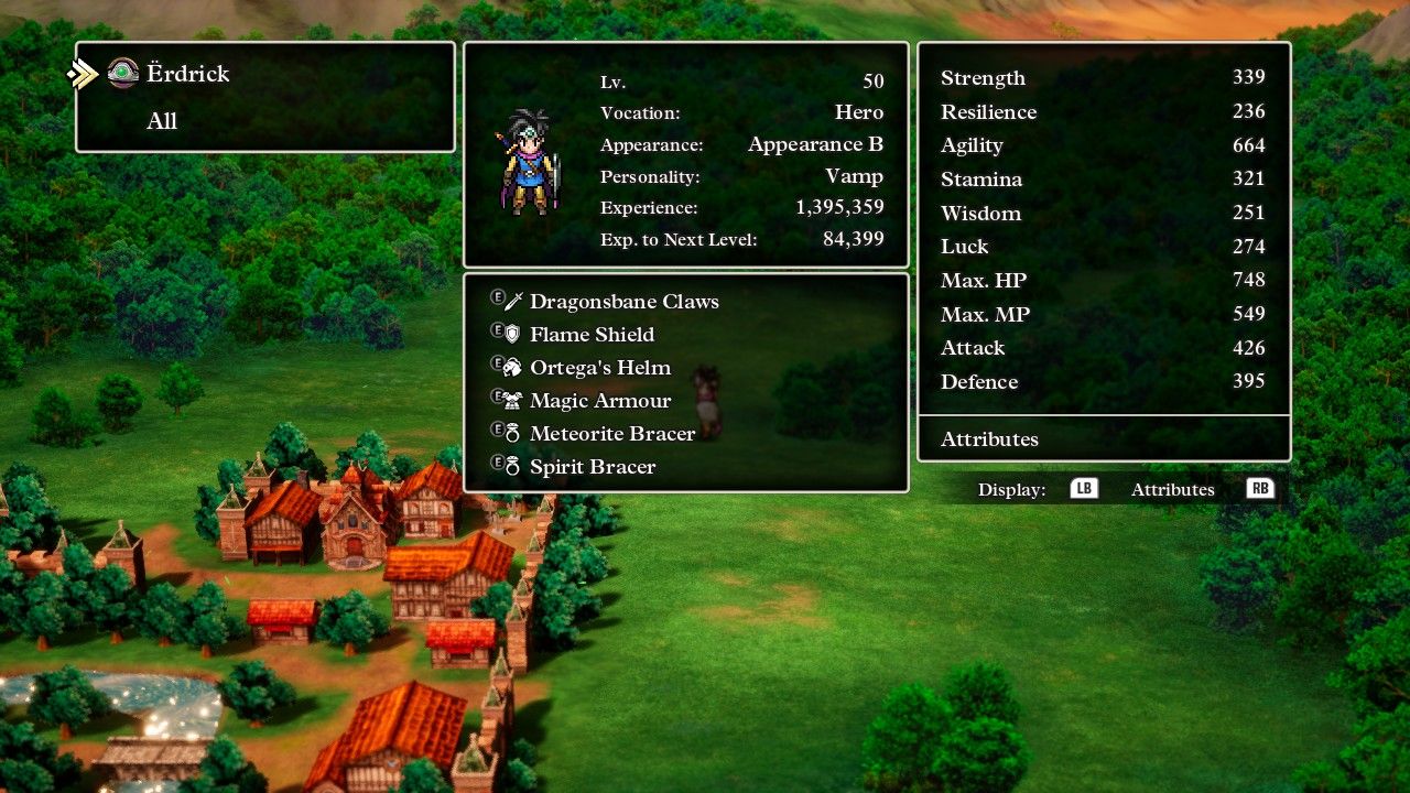 Erdrick leveled to the nice round number of 50 while finishing up that dungeon so I thought I'd show a picture of her stats. To get a sense of the impact from personality bonuses and all those seeds, the Hero's Strength score is supposed to be around 250 at this level while Erdrick was nearly a hundred points higher than that. She was also on pace to max out the HP gauge at 999 before the game was over, suggesting to me that the Stamina stat might not be as important as I had first thought given that solo characters will likely hit the maximum cap via seeds regardless. The good news was that there was a lot of room to push these numbers higher if necessary, Erdrick could theoretically grind for another 40+ levels and gain hundreds of more points in the stats of her choice via farming seeds off random monster drops. They aren't common with 1 in 64 odds to drop following a battle but if absolutely needed she could fight, say, Ursa Majors for their Seed of Strength drops and gain hundreds of more points in the stat.