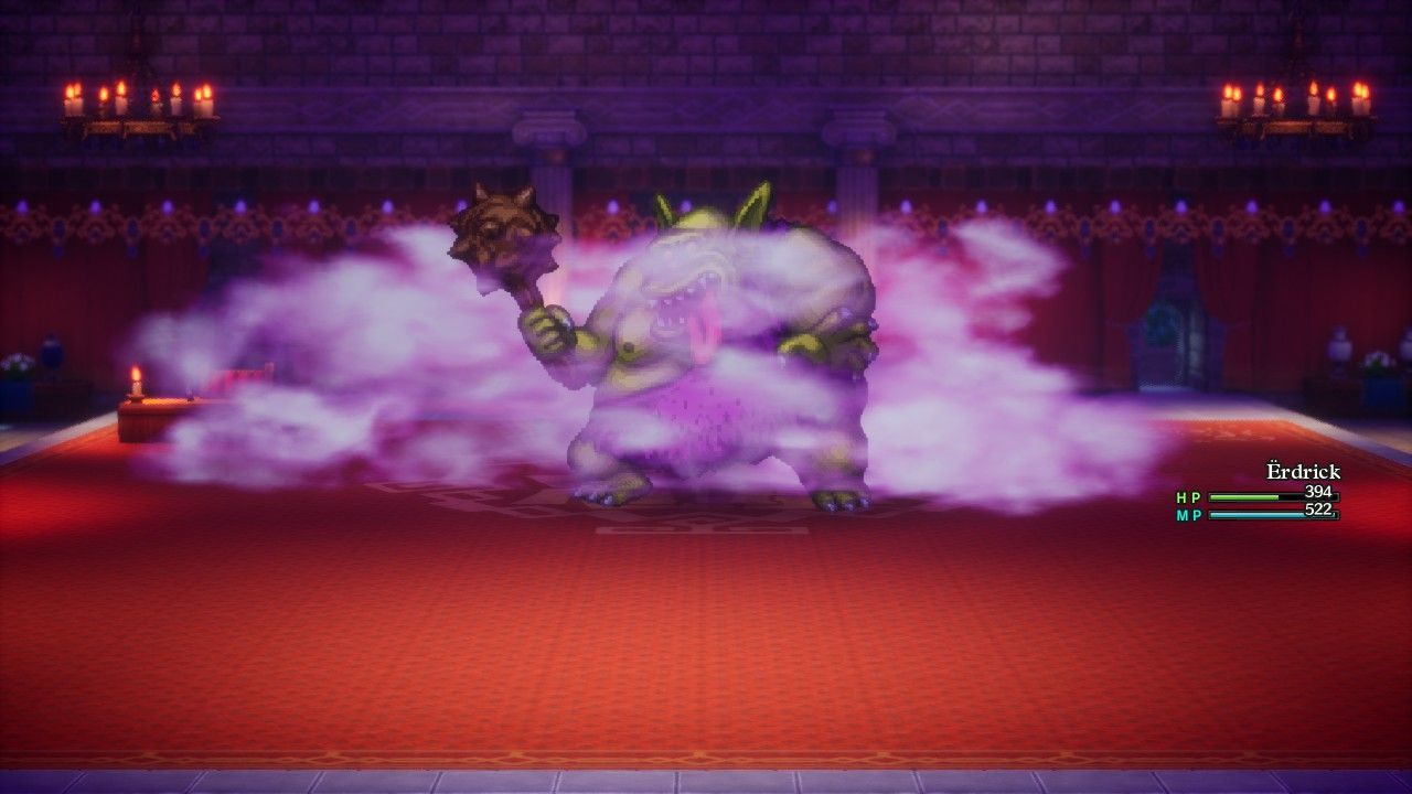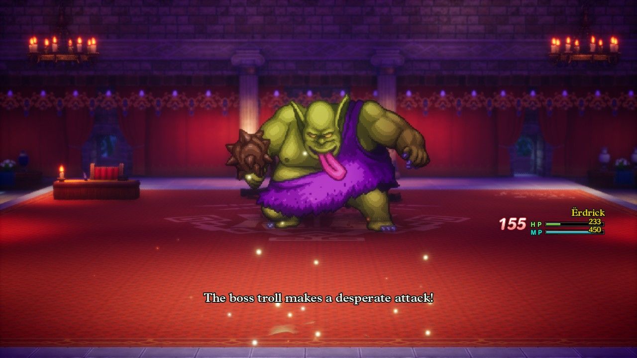 The other potential solution is simply killing the Boss Troll as fast as possible before the party's health runs out. Unfortunately the Boss Troll has a massive healthbar of 5500 HP, which is almost double that of the Orochi - the final boss of the whole game only has 8300 HP! This makes an offensive route significantly harder to pull off, though there are other classes that can deal more damage than the Hero and will likely need to take that path. As far as Erdrick was concerned, she used her Oomph Powder and was hitting with Falcon Slash for roughly 750 damage per strike. Even though this felt like good damage, it still required EIGHT rounds at that pace to take down the boss, not counting the rounds needed to use Oomph Powder and then reapply it after the first usage ran out - sheesh! All told, Erdrick easily won the battle by restoring her health twice with Fullheal and I did get some ideas about how to itemize and strategize for this opponent with future characters. That said, this is going to be a massive challenge and I do not look forward to seeing that grinning green face when playing characters that lack healing options.