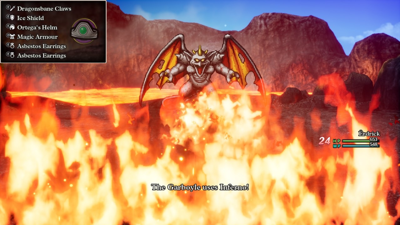 This is the same volcano that Ortega plunged into earlier, by the way, and the HD-2D remake of Dragon Quest 3 has added a boss fight here against the creature that faced the Hero's father. That opponent was the pictured Garboyle who predictably uses lots and lots of fire element damage. In fact, nearly all of the Garboyle's damage is fire-based between the spells Frizzle and Kasizz along with the breath attacks Wildfire and Inferno. The only non-fire spell that this thing uses is Boom which wasn't too scary as the tier 2 explosion magic spell. Erdrick brought a reprise of her Orochi gear for this battle: the Ice Shield, Magic Armor, and double Asbestos Earrings. Together they provided 75% protection against fire-based breath attacks and complete immunity against fire-based spells, which was good because this boss absolutely spammed the ever-loving daylights out of the Frizzle spell which would have done roughly 50-60 damage per casting if unprotected. Inferno's damage was similarly cut from 80-100 down to the pictured 24 damage. The boss fight wasn't a total cakewalk because the Garboyle could sometimes take as many as three actions per round, plus it broke out a buff at the tail end of the battle that doubled all of its magic damage. Erdrick still won on the first attempt and didn't need to use any healing spells, making this boss infinitely easier than that stupid Boss Troll.