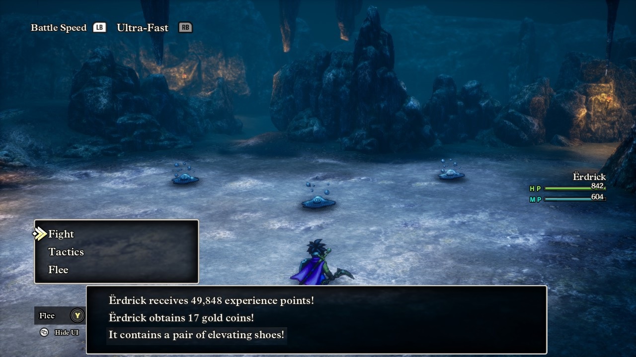 One of the dungeon floors contains Liquid Metal Slimes as an enemy, known as Metal Babbles in the original NES translation. These are the upgraded version of the Metal Slimes from earlier in the game, monsters with a mere 6 HP but an impossibly high Defense rating of 1536 and immunity to all elements. While they typically run away from battle, if the player can manage to land a kill on one of them (usually via a critical hit) then the payout is worth an insane 49,484 experience points. Erdrick saw a number of these things while clearing the dungeon and ended up defeating three of them in three separate battles for the big XP reward. I didn't think much of this until the third battle gave me the message that the Liquid Metal Slime had dropped a treasure chest - what?! That was a 1 in 64 odds result! It produced the Elevating Shoes accessory which is probably the single best accessory in the game. The Elevating Shoes grant 50 Luck (!) along with a passive bonus of 1 experience point per step taken. Even though Erdrick needed about 100,000 XP for each level now, passive experience gain was still passive experience gain and I would have worn the item for the Luck bonus anyway. What an insane reward via pure dumb luck!