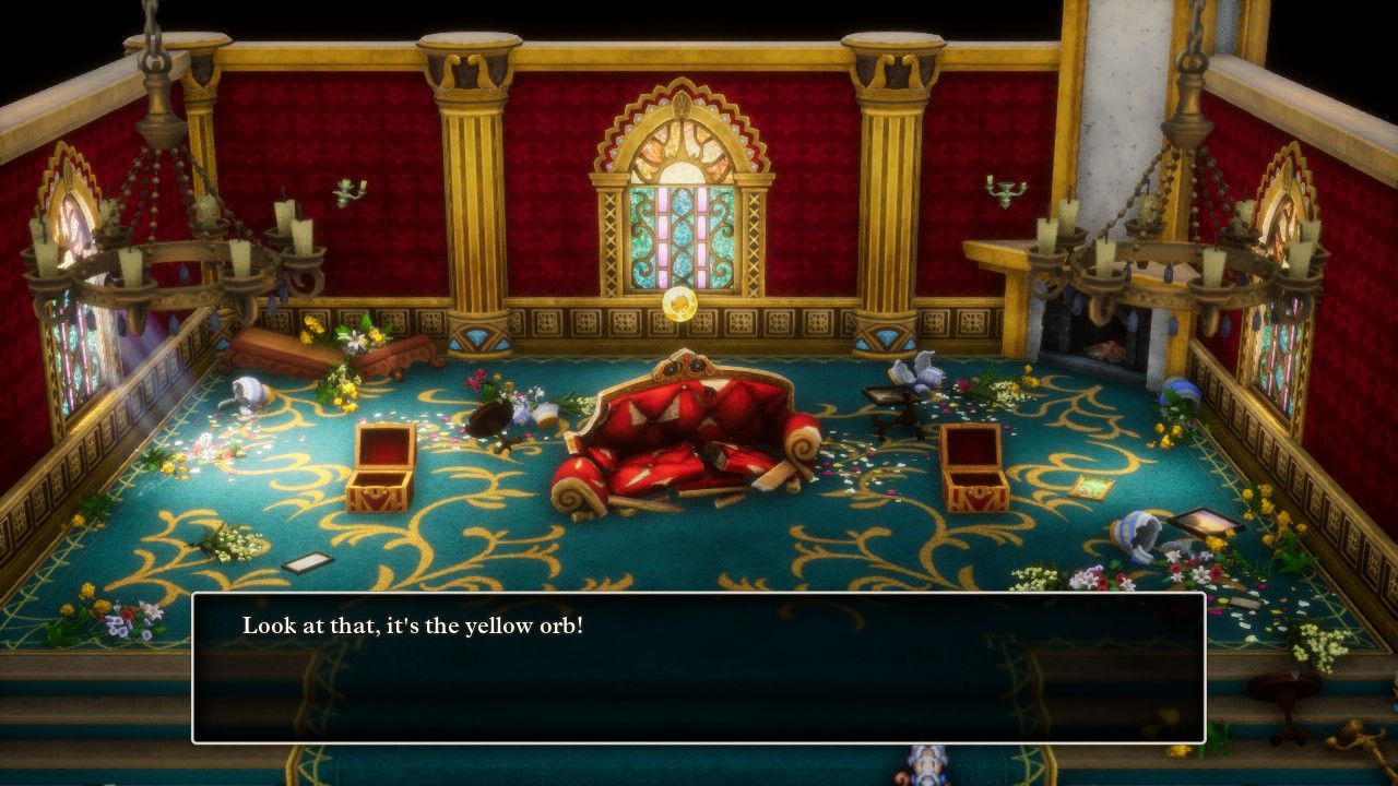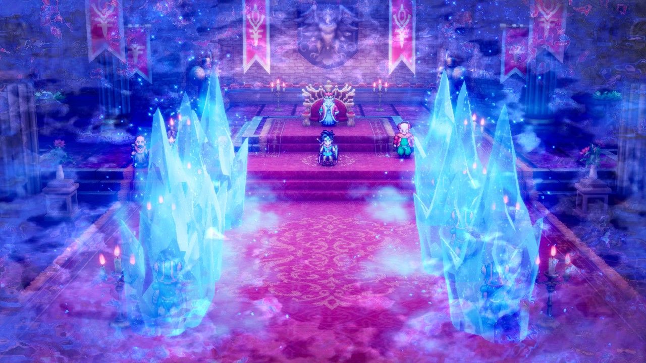 Then she continued further south and grabbed all of the sparkly and secret locations in the vast southern ocean. There's a small version of Antarctica down there which houses the Shrine of the Everbird; the main questline at this point is to collect six orbs hidden across the world to revive a magical flying bird. This area looks great in the HD-2D remake even if the two girls protecting the egg were reminiscent of the two faeries from the classic Mothra movie with Godzilla. (Maybe that's even what the designers were going for here, I don't know.) Northeast of the frozen Antarctica was this world's version of Australia, containing the town of Lanson where everyone speaks with (bad) Aussie accents. That town sells an item called the Fading Jenny which turns the party briefly invisible; this is used to recruit some monsters that don't like your appearance, as well as sneak into the castle town of Edina in the British Isles. Edina contains this infamous puzzle: