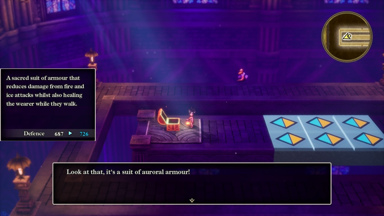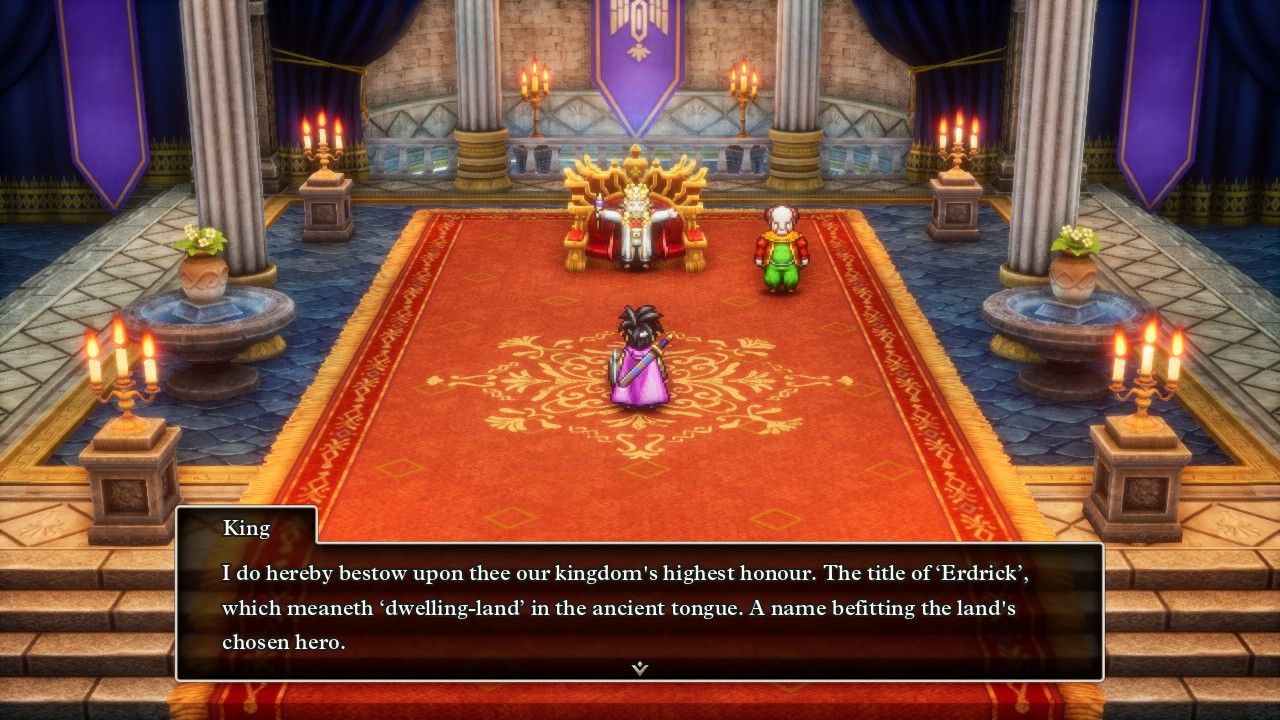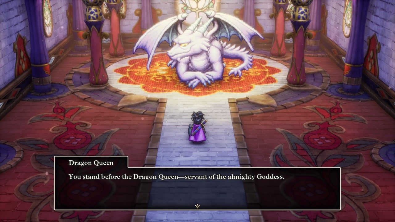 At the end of the last part, Erdrick discovered that there was another even bigger baddie to defeat named Zoma and their her quest wasn't finished yet. The king of Aliahan reacts to this news by demonstrating that he's a true politician, insisting that all knowledge of Zoma must be kept secret to keep the townspeople from panicking - what a stellar example of leadership. Erdrick had a better plan and set out for the secluded Castle of the Dragon Queen, previously blocked off from access by a range of mountains and a shroud of cloud cover. (This is a change from the NES version, where it was possible to visit this castle before defeating Baramos but the doors to go inside were locked.) The name of this place turns out to be accurate as it does contain a Dragon Queen, who happens to be dying and bequeaths an item known as the Sphere of Light to Erdrick before passing away. I mostly wanted to include this screenshot because the Castle of the Dragon Queen is another gorgeous location in the HD-2D remake; just look at the intricate floral detailing on the walls and the floor in this room. The developers did not have to go this hard with the visual details but I'm glad that they did.