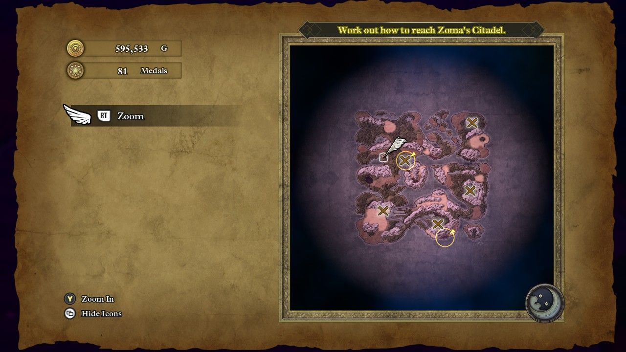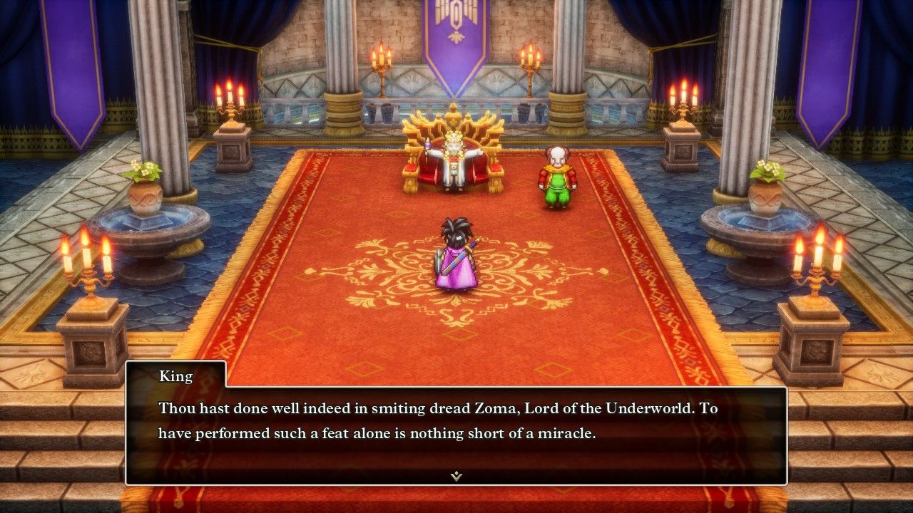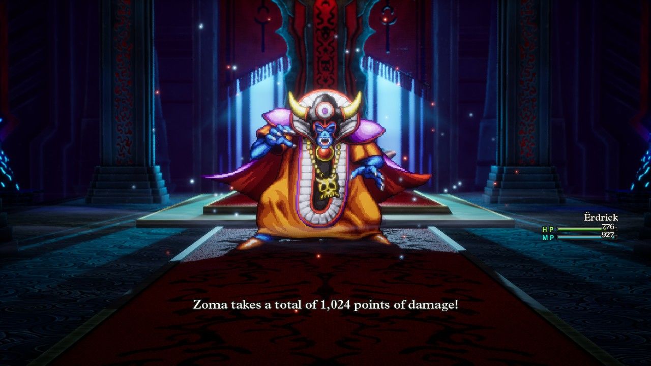 This prompted an escape sequence from the citadel, which immediately began collapsing in classic "defeated villain" fashion. Erdrick found herself in the Talontear Tunnel again, for some unexplained reason, where she made her way to the surface and found the supernatural darkness dissipating from the world. Unfortunately, the defeat of Zoma also apparently snapped his connection back to the overworld, as it was no longer possible to teleport back to Aliahan or any location outside of Alefgard. Erdrick made her way back to Tantegel where the king does have an extra line of dialogue for the specific case of a solo Hero completing the game without any companions. Then he announced a special title for our heroine: