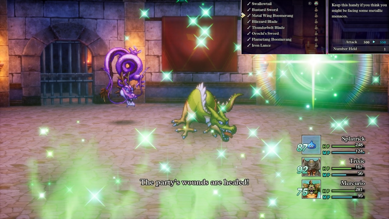 The monster team that Erdrick put together consisted of Splatrick the Slime, Trixie the Prestidigitator, and Mercurio the Mermaniac. All of these monsters were rated around Level 50 and it wasn't really possible to get any friendly monsters with higher stats until venturing inside Zoma's Citadel. Splatrick was essentially a melee fighter with good all around stats, Trixie was an offensive spellcaster, and Mercurio was the designated healer. I discovered through trial and error that it's absolutely mandatory to bring a healer into the more difficult monster arena battles, since the team has to win four fights in succession and the enemy monsters start doing way too much damage to tank through each fight. Mercurio had the Multiheal spell which was absolutely indispensible given how many area-of-effect abilities the enemy monsters were using by this point. This team cleared the tier 8 arena without too much trouble, only to struggle against the tier 9 arena which is the toughest one before accessing postgame content. There's a lot of randomness in these monster battles since the player can't directly control their actions, only give general instructions from the sidelines. I failed four times in a row at the tier 9 arena before finally getting lucky on the fifth try; Trixie died in the third fight but Splatrick and Mercurio were able to carry onwards, concluding when Mercurio won a dramatic 1 vs 1 duel against the final monster in the fourth fight. Success!