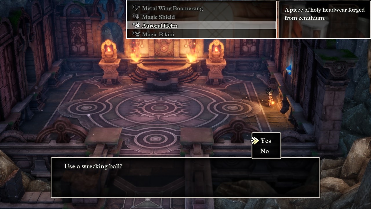 There was another Hero-only equipment item available via fetch quest sequence. This process began in the town of Kol, which contained a family of refugees from Jipang that made their way here to escape the Orochi. Erdrick went and fetched the smith's set of tools from back in Jipang using the magic of the Zoom spell, then dug up some Orichalcum from a horse pasture in Damdara and fetched the Broken Blade from a scholar in Cantlin. Bringing all this stuff to the smith in Kol allowed him to reforge the broken weapon into the Sword of Kings, the weapon with the highest Attack value before reaching the postgame content. The Hero is the only class that can use this sword and it also casts the Kaswoosh spell when used in battle which was occasionally useful against big mobs of opponents with wind element weaknesses. I was also amused to note that the cut scene that played when forging the Sword of Kings transformed Erdrick back into her normal attire; I guess the developers didn't think about someone wearing the Magic Bikini while finishing this quest sequence. Note that the Sword of Kings was present in the original NES version of DQ3 and required the same quest sequence, though the Auroral Helm was a later addition created for the remakes and none of that stuff with the wrecking ball existed originally.