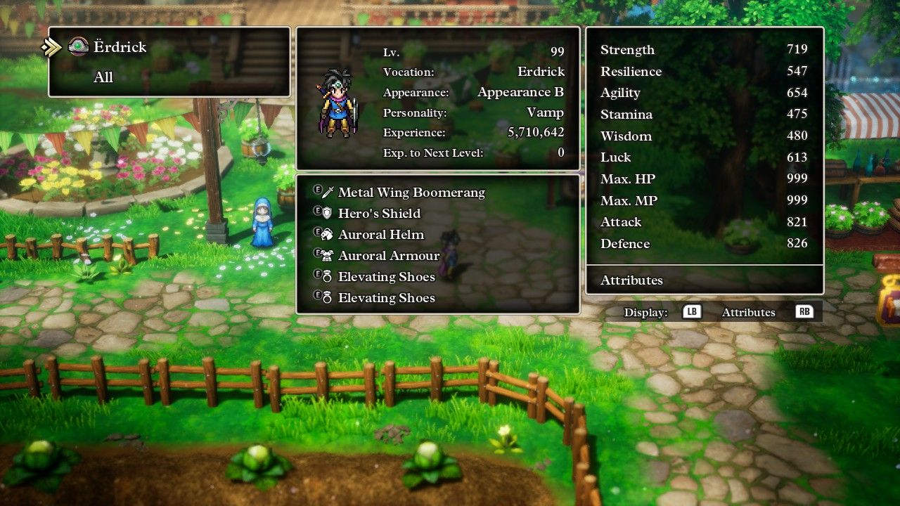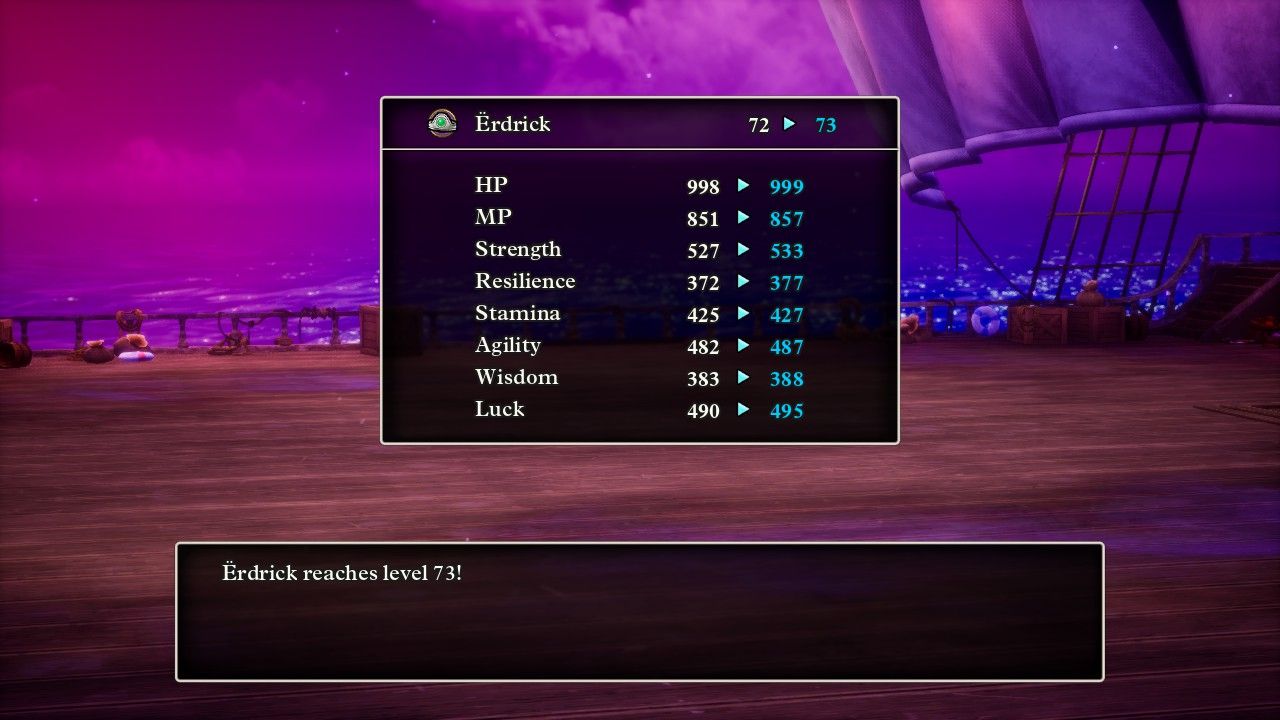 Speaking of stats, one of the big questions that I had going into this solo playthrough was whether max health was capped at 999 or if the value could continue onwards to four digits. I was able to increase Erdrick's health to 998 HP using some Seeds of Life, and then Erdrick failed to gain any health upon hitting Level 71 and Level 72. This meant that she was due for a big increase to her health total at Level 73, with an expected increase to about 1020 HP... only to find that, sadly, her health value was indeed capped at 999. This was profoundly disappointing even though I wasn't really surprised since this game was made by the same team as Octopath Traveler which similarly capped all the stats at 999. It doesn't make much sense: if you design the gameplay such that characters can go well above the 1000 mark, why not program in an extra digit for exactly this reason? That can't be difficult to implement. I estimated that Erdrick could have reached about 1300 HP by the end of the game if she wasn't being artificially limited in this fashion.