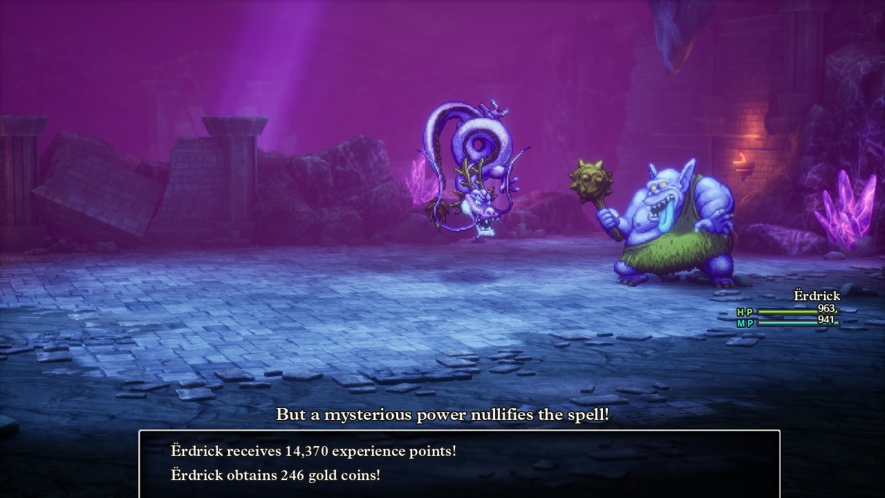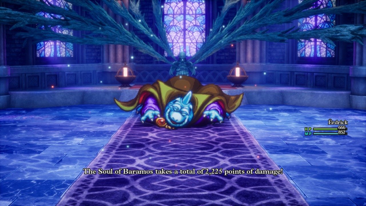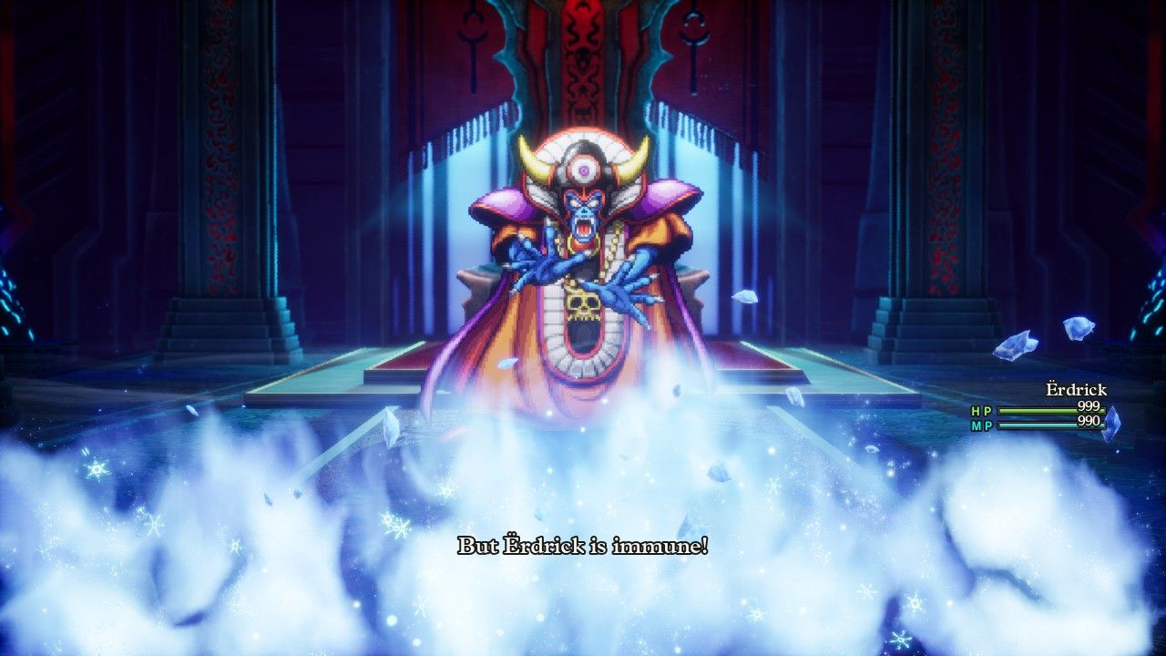 In any case, I wanted to do the boss fight the standard way since Erdrick was still scouting the path for other potential variant characters. She had equipped a bunch of gear that protected against ice element, with double Antifreeze Earrings in the accessory slots, since Zoma uses a lot of ice stuff in the same way that the original Baramos spammed fire element attacks. In retrospect, I probably should have brought the Fire Shield over the Hero's Shield since the latter only defended against ice breath attacks and not the spellcasted versions. All of these items meant that Zoma's C-c-cold Breath attack (yes that's the actual name) had no effect instead of inflicting the intended 120-140 damage, while Kacrackle's intended 88-116 damage was cut by 75% down to 20-30 damage. Zoma really liked to spam those two abilities, including one turn where he cast Kacrackle three times in a row. But with his breath attack doing nothing, his physical attack hitting for 25 damage at a time, and Kacrackle doing barely more damage, Zoma wasn't exactly burning through Erdrick's lifebar of 999 HP. She actually could have taken rounds doing nothing but using Special Medicine items and still come out ahead on healing most of the time.