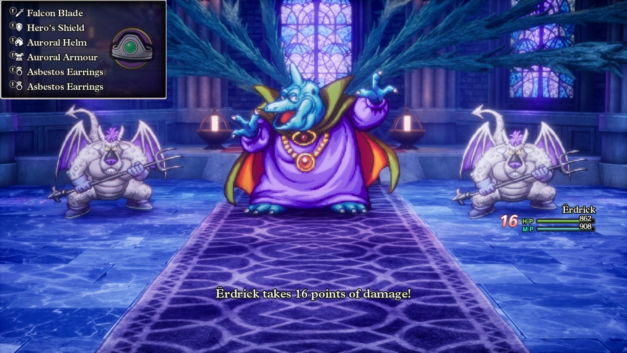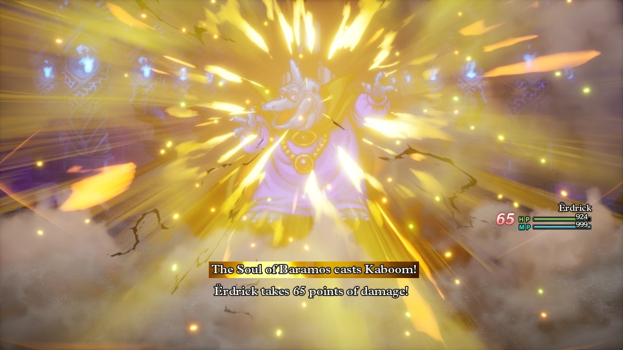 This was the Soul of Baramos, a palette-swapped version of the same Baramos from earlier. This time the blue dinosaur appeared with a pair of Ashdemon minions who liked to buff the Attack and Defense ratings of Baramos as well as cast some weak healing spells on their master. The Soul of Baramos remains a spellcaster for the most part, mixing in some physical attacks that did very little (16 damage? come on) along with repeated casts of the Kaboom spell and the Inferno breath weapon. Erdrick equipped a pair of dual Asbestos Earrings yet again which was sufficient to completely neutralize the damage from Inferno along with the Hero's Shield and Auroral Armor. Given how much the Soul of Baramos spammed the Kaboom spell though, I probably should have brought the Tempest Shield instead, which would have allowed Inferno to deal modest damage but cut the damage from Kaboom by another 33%.