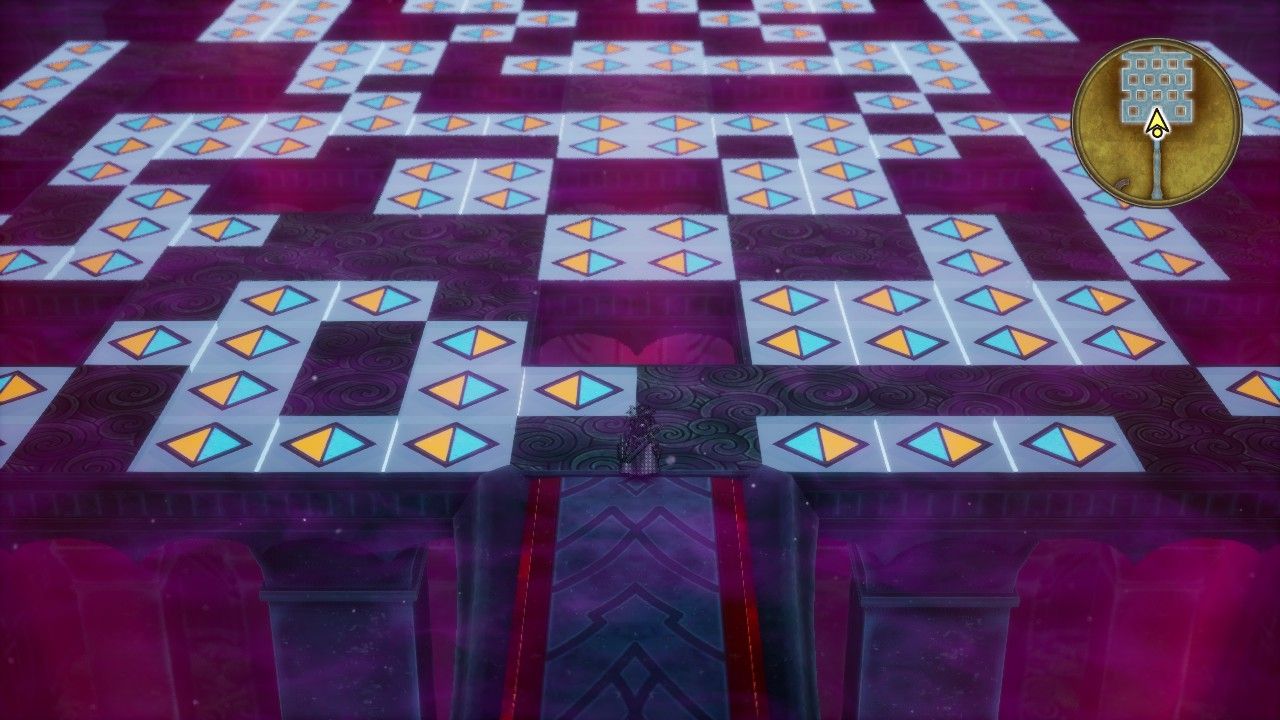 The bottom floors of Zoma's Citadel contain these arrow tiles designed to throw off the player. These things were present in the NES game as well and they change the directional inputs from the controller. The trick is that the blue arrow always points in the new direction of "up" while the orange arrow points to the new "down", with the other directions rotated accordingly. This can be wildly disorienting at first but ends up being fairly easy to navigate with a little practice. Erdrick navigated through this floor without falling into any of the pits by accident, claiming the few treasures to be found in this dungeon along the way. The best of these is the Shimmering Dress which every class can equip so long as the character is female. I would normally wear that for all of the endgame boss fights, except that Erdrick's Hero class had access to the slightly superior Auroral Armor instead. It's another reason why all of these solo characters have to be women since they have much better equipment options in the lategame.