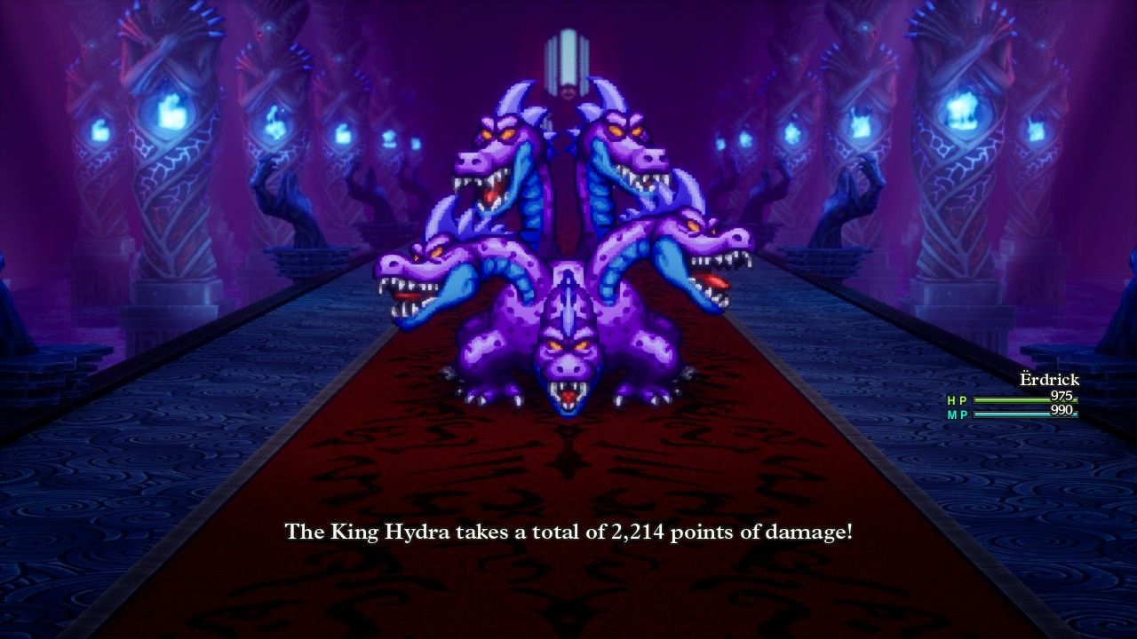 This palette-swapped version of the Orochi is named the King Hydra; this is a place where the NES origins of DQ3 are particularly obvious given all of the reused monster designs. The King Hydra casts no spells and instead uses the Inferno breath attack as its primary weapon, which Erdrick was able to counter completely using the same anti-fire setup employed in some of her earlier boss fights. Oddly, the King Hydra spends a lot of time trying to inflict various different status ailments, using War Cry in an attempt to stun characters, Fog of War to block spellcasting for the next three turns, and Sweet Breath to put the party to sleep. And while that stuff was certainly annoying when it landed, the King Hydra couldn't really deal any damage once the fire elemental properties of Inferno were completely blocked. The big snake could use its physical attack for about 25 damage and, uh, that was it. This was basically a joke boss fight as Erdrick used some Oomph Powder and then Falcon Slashed for 2200 damage at a time. King Hydra does regenerate about 100 HP per round but that was nowhere near sufficient and the thing quickly expired. Maybe Ortega wasn't such a great warrior after all if he couldn't overcome this threat.