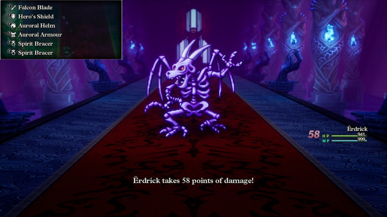 The third of these bosses presented a completely different challenge from the first two. This was the "Bones of Baramos" boss (enough with Baramos already!) who does not cast spells and does not use any breath attacks. Instead, this is an all-physical boss who will attack 2-3 times per turn and try to wear down the player with accumulated physical damage that can't be resisted. It can even use the Double Up ability which doubles its physical Attack at the cost of taking doube damage as well for the rest of the turn. As such, Erdrick equipped all of her gear with the highest Defense rating along with a pair of Spirit Bracer accessories that each contained another 17 points of Defense. This raised her total Defense up to 849 points which lessened the damage from the Bones of Baramos while not stopping it completely. The skeleton could still hit for 50-60 damage at a time which would accumulate quickly given its multiple attacks per round; this boss has by far the highest Attack rating in the whole game, 545 compared to 310 for the Soul of Baramos and only 390 on Zoma himself. The Bones of Baramos also heals for 290-400 HP every single round which looks like it could be a huge problem for a low-offense character setup. The player absolutely must kill the Bones of Baramos quickly due to its constant regeneration and unending melee blows.