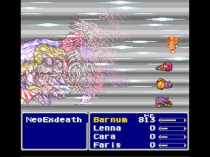 Ultimately I hit on another strategy: give up the Chain Whip, move up to the front row, and use the Dancing Dirk, hoping and praying to land some Sword Dances at long (1/8) odds. This was quite random, yet if I kept trying the battle over and over again, I was bound to land two Sword Dances close together (each doing 3500+ damage) and get past Exdeath that way. This actually worked very quickly: Barnum got his Sword Dances, moved into the back row again, and concentrated on using Hi Potions to defend while Exdeath killed himself with spells reflected off Barnum's Wall Ring: