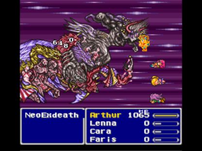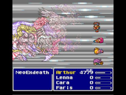 Against the initial "Tree" form, Sir Arthur began the fight by equipping the Defense Sword (to cast Armor again) and the Aegis Shield. O, that wonderful Aegis Shield! Its ability to block the Stone instant death attack nullified the one great danger in this boss fight, Exdeath's White Hole. It was well worth giving up the extra damage from Double Grip. As such, Arthur won on the first try without issue.