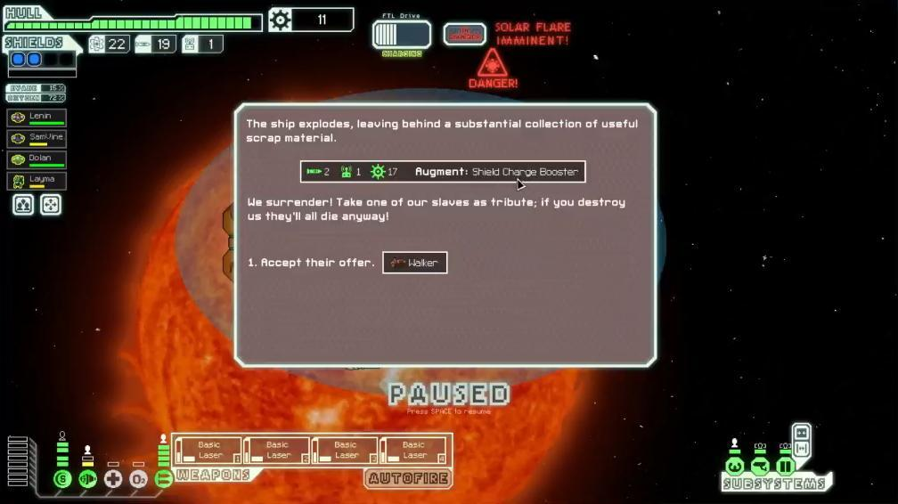 The next sector was rebel-controlled. Sulla did have to be a bit careful with fuel, as he realized near the start of this sector. With no way to buy fuel, surrender offers containing decent amounts of it were appealing. He actually managed to kill all the crew on the first ship he encountered here - fighting off a boarder and killing the pilot via lasers. The reward for this was a Flak I. He needed to upgrade weapons to level 5 to put it into play, but it was more than worth it. Fire the Flak to take down the shields, then unload with the lasers. He figured if could just get his hands on one more weapon, he'd be set for the rest of the game. This weapon came just in time for the next battle, which had a ship with a Defensive Drone II and two shield bubbles.