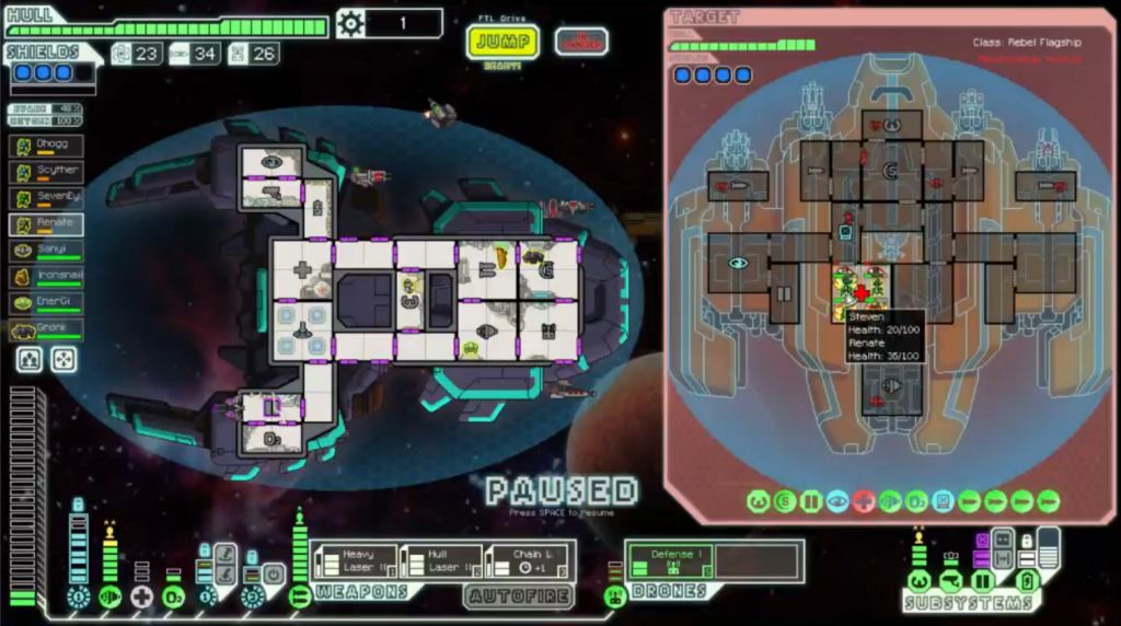 Finally the Slug + Rockman boarding squad managed to take out the enemy missiles, even as system after system on my ship continued to fail. I could not repair the damage, not with disabled Doors and only two crew on board, one of them Mind Controlled half the time. Eventually I got a strong volley of shots through, which disabled the Mind Control and breached the hull. Like an auto scout, the rebel flagship AI will never repair a system if the hull is breached in that room, so I wouldn't have to deal with that threat again. Sadly the missiles were back online again, and the boarding team would have to disable them yet again. I probably should have told them to go after Piloting first, as once that was disabled all of my lasers would have had 100% to-hit odds. I'll keep this in mind for the future. The boarders were now working on the piloting room, and I'd gotten a shot through onto the rebel shields as well, but my own Defensive Drone had been knocked out, and the Engine room and Shield room were burning. If only I had my Mantises alive, this would have been so easy! Instead it was coming down to the wire. Both ships were in absolutely dreadful shape by now; systems knocked out everywhere, rooms burning, hull breaches leaking oxygen out into space. We both started with full crews, and nearly all of them were dead. What a battle! It just came down to which hull was going to hold out longer, and I had barely enough of an edge to reach the finish line first: