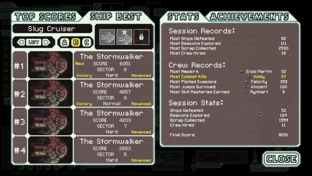 The final score finished just over 6000, which is above average for a Hard victory. All of those crew kills definitely did add up over the course of the run. I also managed to accumulate almost 2000 scrap, and that's more than enough to make for a comfortable endgame. Note that I only have two total wins with the Slug B, once on Normal and once here on Hard. It's definitely not one of my favorite designs; I simply don't take this one out for a spin that often. Voldy the Mantis also set a new record for most crew kills, which is pretty funny since several of them were kills of my own dudes when Voldy was Mind Controlled in the final fight! Apparently they also count towards the total, heh. It's very rare for me to break any of the records on this screen after 300+ games of FTL, and fun having that particular record go to a Mantis named after a longtime Livestream viewer.
