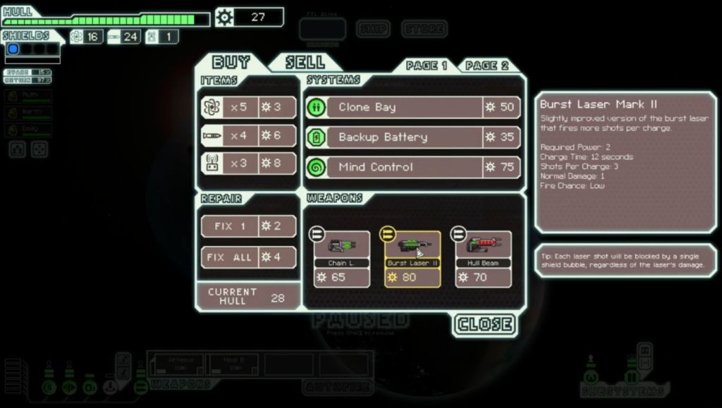 Why hello there Mr. Burst Laser II. More tallying of numbers led me to the realization that I could purchase the weapon - but only by selling everything that I had, the Slug Repair Gel along with the Artemis Missile and the Healing Burst. The stream viewers correctly pointed out that this would leave my crew with absolutely no way to heal themselves if they took damage. This was a very tough decision. All manner of things could potentially go wrong: enemy crew boarding my ship, fires caused by a battle over a sun, an unsealable hull breach due to inability to heal damage taken from oxygen deprivation, etc. You get the idea. Was it worth the gamble? Well, one of the things that I've learned over many months of playing this game is that strong weapons tend to be the single most important factor in success or failure. Powerful guns allow the player to take out enemy weapons before they can deal damage, therefore providing both offense and defense at the same time. The rebel ships on Hard difficulty are simply too strong to sit back and hope that your defenses will protect you from damage. I've almost always done better by taking the fight to them, destroying targets before they can hurt my ship. In other words, give me that Burst Laser II and we'll sort everything else out in time! I made the purchase.