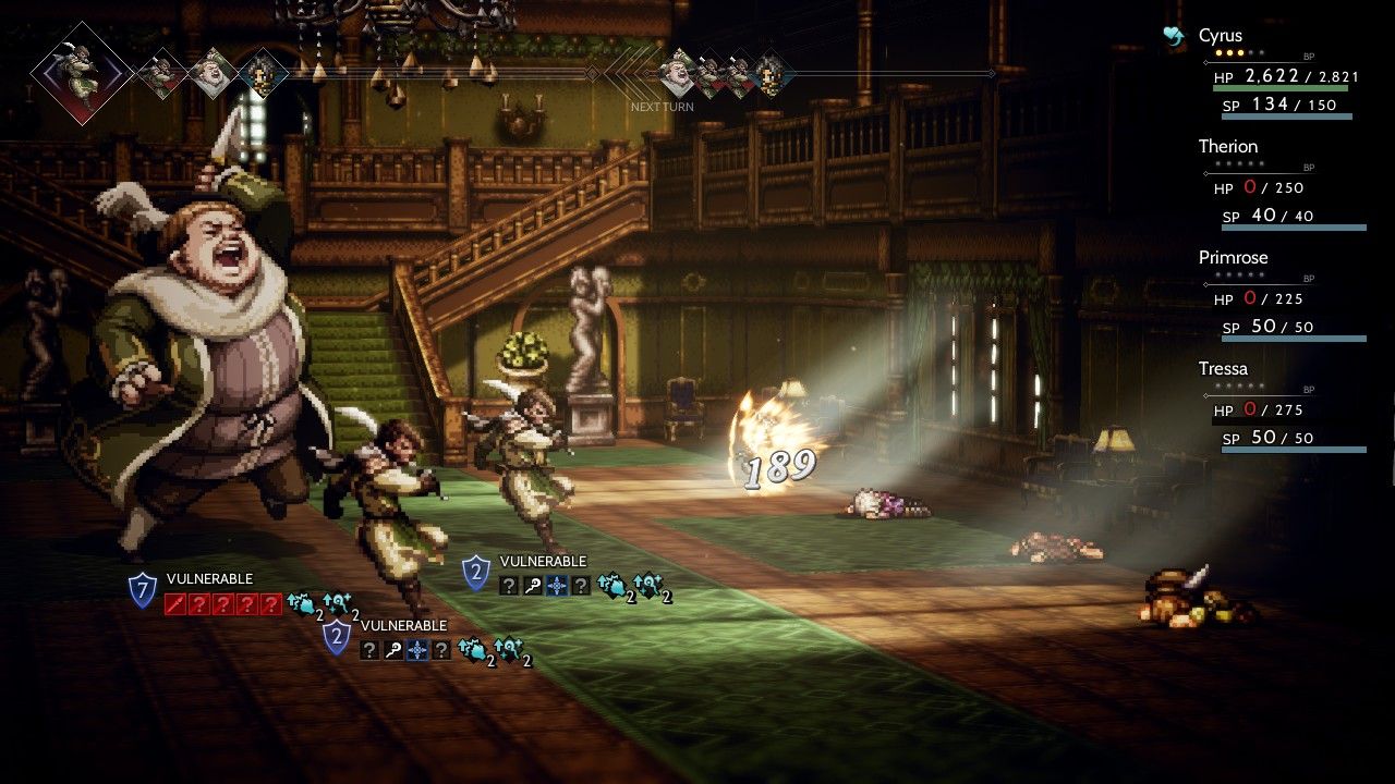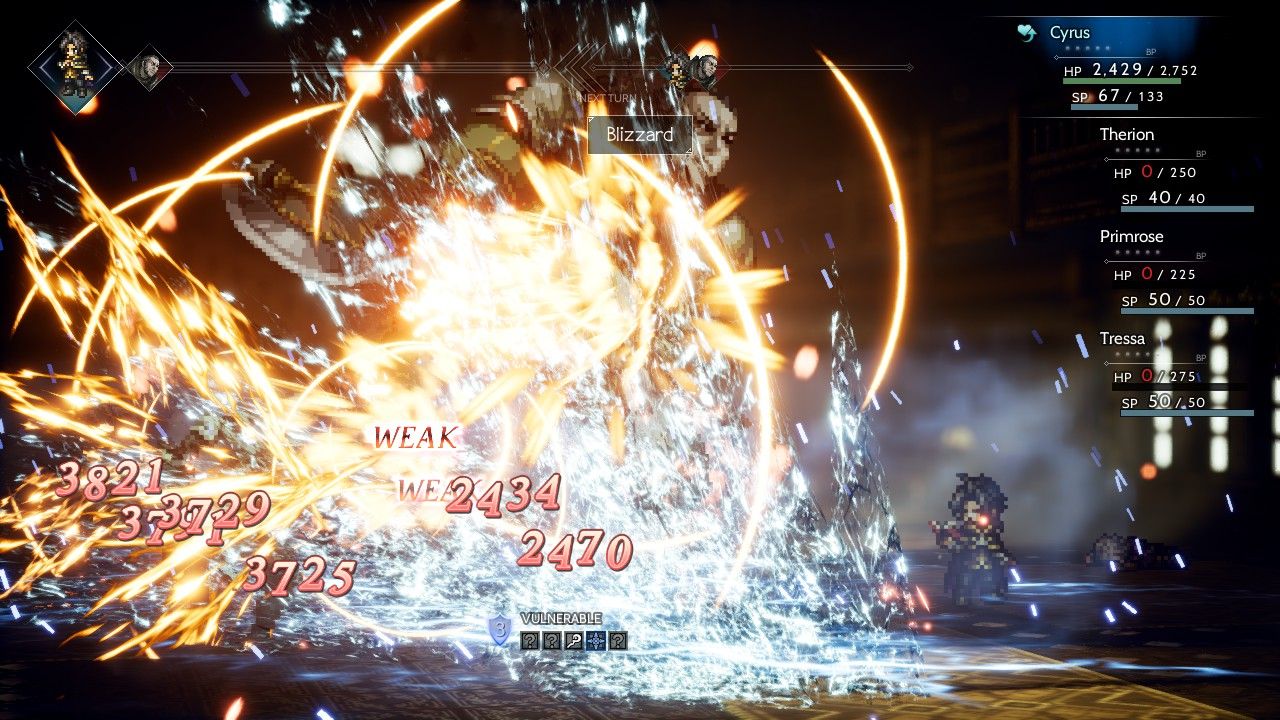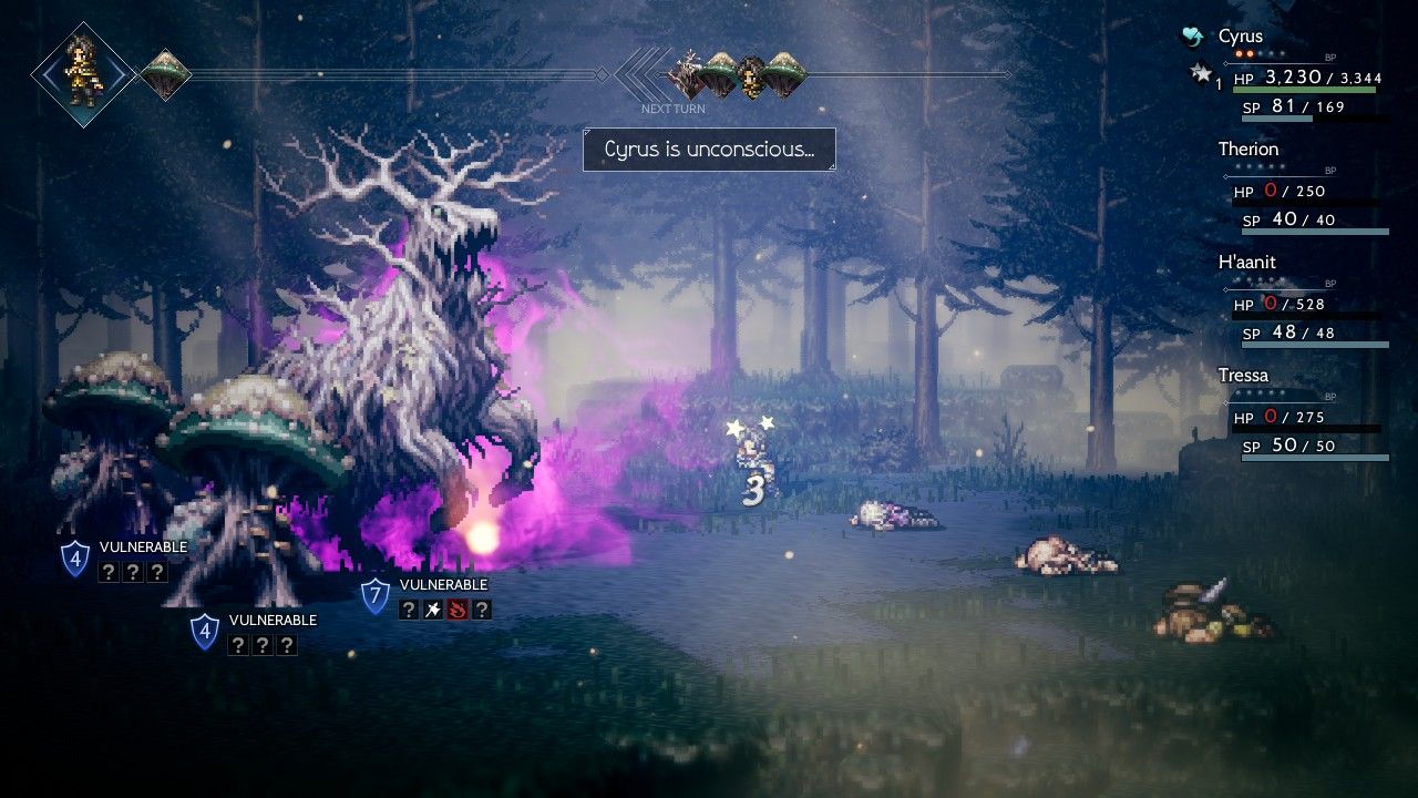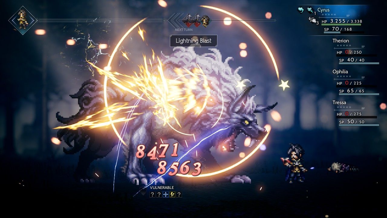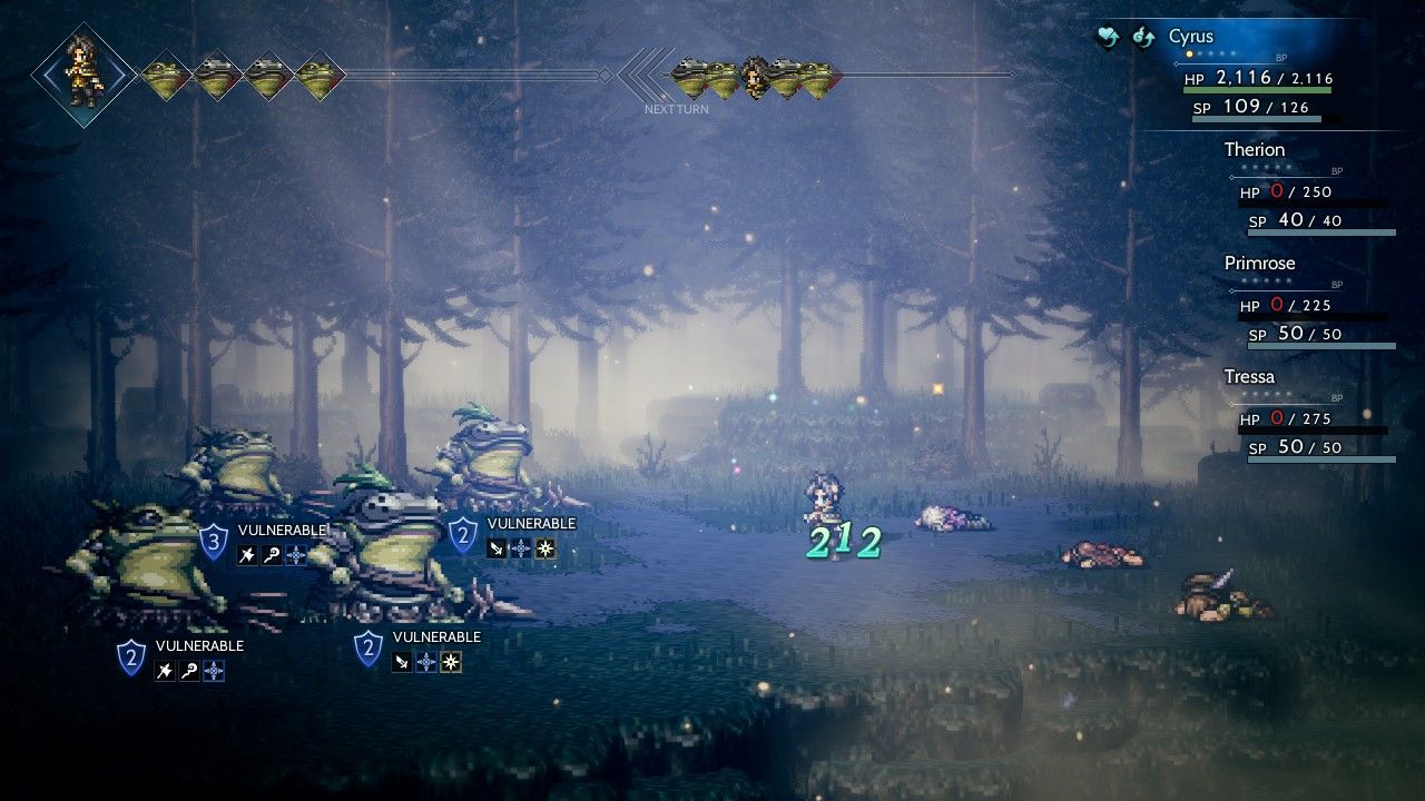 What I wouldn't have given to put Vim and Vigor on someone like Olberic or Alfyn who had gigantic pools of health and would have seen a correspondingly large benefit. It genuinely was helpful for Cyrus though, doing a lot to keep him safe in both random encounters and scripted boss fights. I had Cyrus equipping accessories with extra HP on them for safety's sake and that synergized nicely with this support skill at the same time. More total HP meant more per-round regeneration and a Cyrus who hopefully stayed upright.