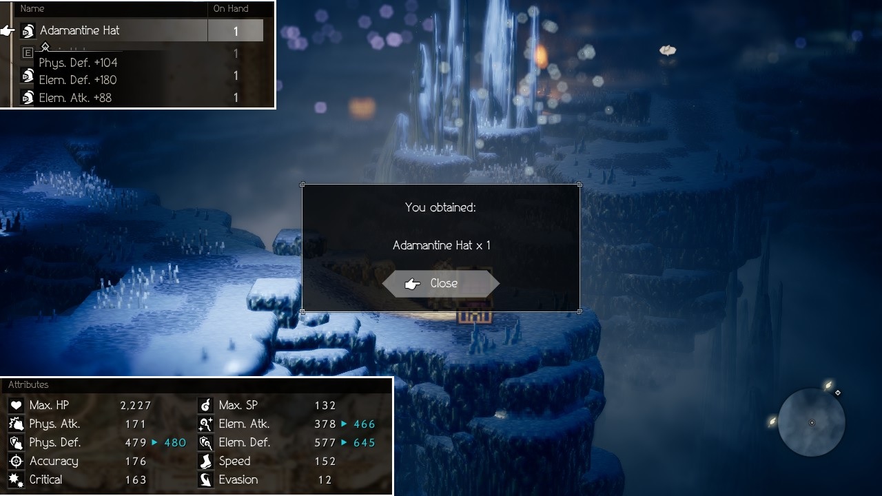 Pictured above: more fun with Elusive Maneuvers. I'd written previously that Cyrus could travel basically anywhere in the world using this support skill and now I was putting that rhetoric to the test. (It's no wonder why the Octopath Traveler speedrun likes this skill so much, it can take you pretty much anywhere in safety.) The best helmet in the whole game is the Adamantine Hat, available in a purple treasure chest hidden in the Maw of the Ice Dragon dungeon deep within the Frostlands. The suggested level for the place is 45 and Cyrus wasn't even half of that yet, not to mention playing the game as a solo character to boot. Nonetheless, Cyrus sauntered in there and plucked the helmet out of its chest, then fast traveled back to town for safety with his heist secured. The Adamantine Hat was a truly remarkable pickup for Cyrus, with the highest elemental defense in the whole game paired together with excellent physical defense, plus a bonus 88 more points of elemental attack. It was almost like getting another Elemental Augmentor accessory for free! Goodbye Oasis Hat, say hello to an item that would almost never leave Cyrus' noggin for the rest of his days.