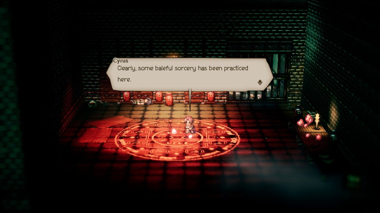 I continued with Cyrus' own Chapter 2 storyline next since it took place in the same town of Quarrycrest. The plot for this tale has Cyrus tracking down a former colleague and investigating a series of missing townspeople. It's a little bit weird how no one else seems to realize that all of the disappeared individuals vanished right next to a huge network of underground sewers. Huh, I wonder where they could have gone? Come on people, it doesn't take a genius to sort this out! Anyway, Cyrus follows the trail to a hidden subterranean laboratory where the poor townspeople are being sacrificed to make blood crystals in a scene highly reminiscent of Full Metal Alchemist. Ever the brilliant thinker, Cyrus spouts off lines like the one above before admitting that he also has a fascination for the dark arts. Our hero, ladies and gentlemen! More seriously though, Cyrus does get down to the business of rescuing the kidnapped individuals who are still alive, which means picking a fight with the individual responsible, Gideon.