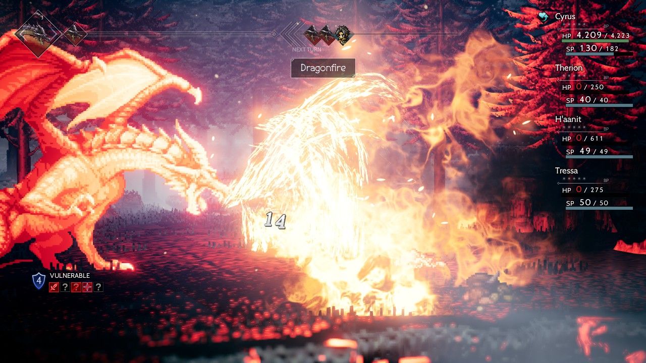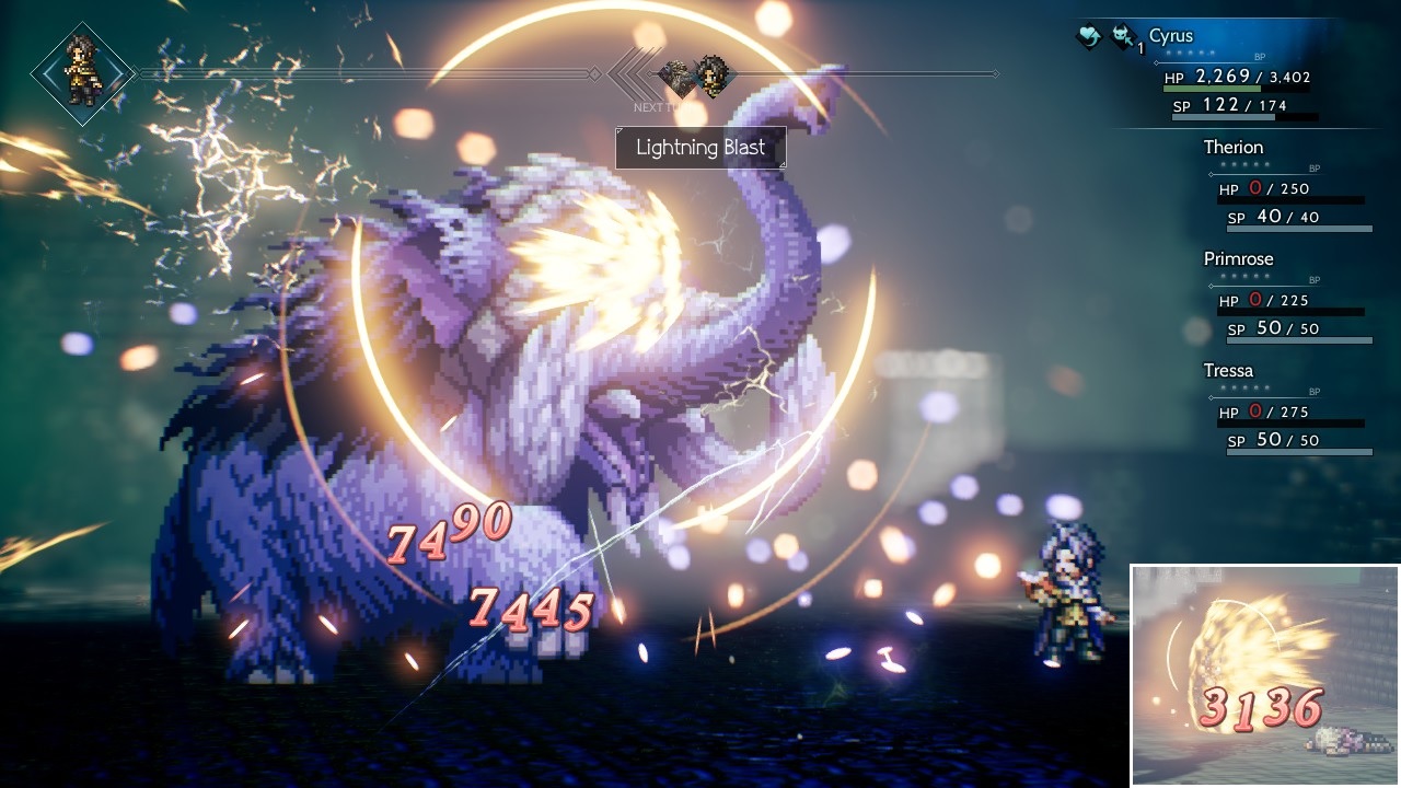 There was both a Cait and a Cultured Cait here! These are Octopath Traveler's version of the "very rare enemy worth lots of gold/experience with high defense that tries to run from battle" staple of Japanese RPGs. Most characters would be stuck breaking a soulstone and hoping that it dealt enough damage to defeat these elusive opponents before they ran away. Not Cyrus though: he was able to cast Fire Storm immediately with the default starting boost point and deal 20 * 2 = 40 damage to both Caits, downing them instantly. Unfortunately the Cultured Caits don't provide that much experience, instead yielding enormous amounts of job points. A typical battle at this stage of the game is worth about 20-30 job points, and this encounter payed out more than 600 of them! Totally worthless for Cyrus though, as he had long since maxed out his starting Scholar job. At least the Cait was still worth a lot of experience, with 1000+ XP nothing to sneeze at even in Octopath Traveler's endgame.