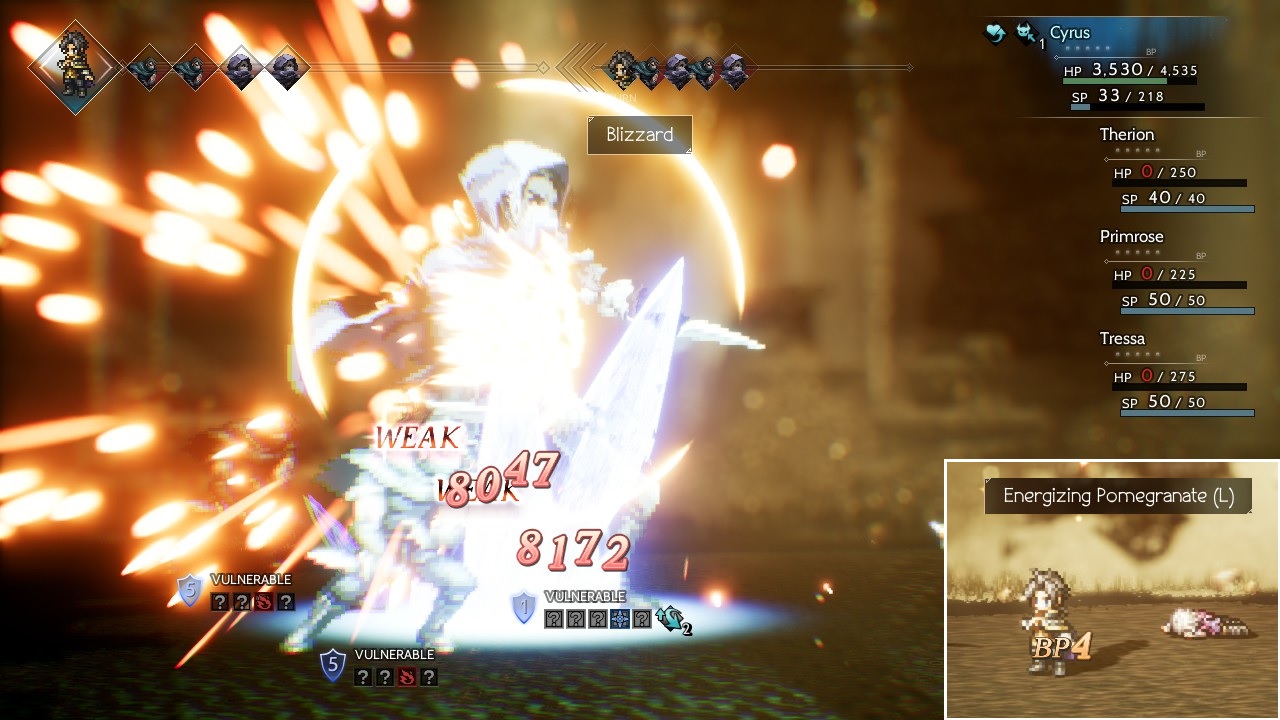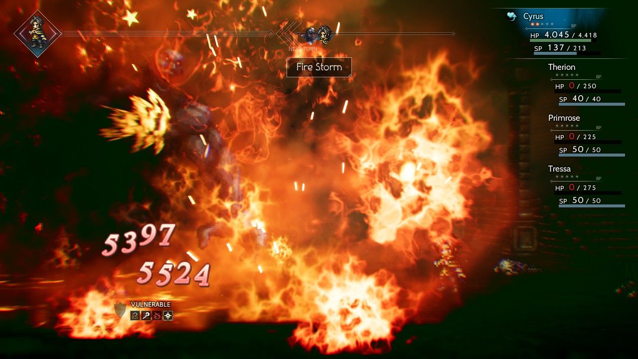 It was much the same story against Albus in Primrose's Chapter 3 story. The accessory of choice this time was a Bright Stone instead of the Inferno Amulet, with the Empowering Necklace still firmly locked in the other accessory slot. Albus only had wind and light for his elemental weaknesses, neither available to Cyrus, and so it was another long process of hitting for 2600 * 2 = 5200 damage at a time against an unbroken target. That was honestly downright good against a boss who couldn't have his shields broken, much faster and more reliable than what Alfyn had been able to put together. Albus summoned a pair of minions after he dropped below 50% HP but of course Cyrus could blast them away immediately by hitting their fire or lightning weaknesses. This was another easy battle.