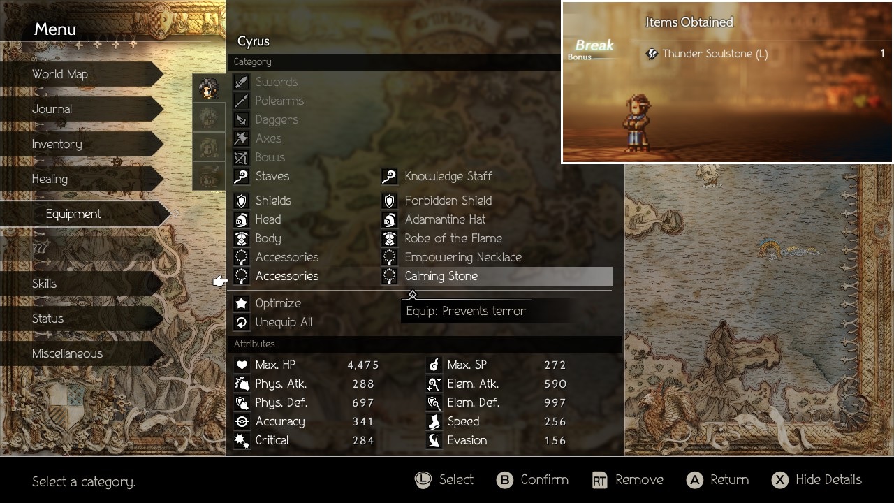 In the meantime, I went around accumulating as many of the Nourishing Nuts as possible to increase Cyrus' HP total. There are only three of the large version of this item to be found, and I was able to acquire two of them from the final Sir Miles quest reward and a Townsperson in Riverford. (The final one only unlocks as a Purchase/Steal item after finishing Ophilia's Chapter 4 storyline.) Paired along with a Medium Nourishing Nut from one of the merchants in Grandport, that added up to 4 + 4 + 2 = 10 * 60 HP = 600 additional health for Cyrus. This took him over 4000 HP in total (with the Empowering Necklace equipped) which brought him into the playable range for the Chapter 3 stories. The bad news was that I had nearly exhausted all of the Nourishing Nuts in the whole game and Cyrus still had a highly unsafe life total. If he ever had to remove that +1000 HP accessory, he was going to be in real trouble.
