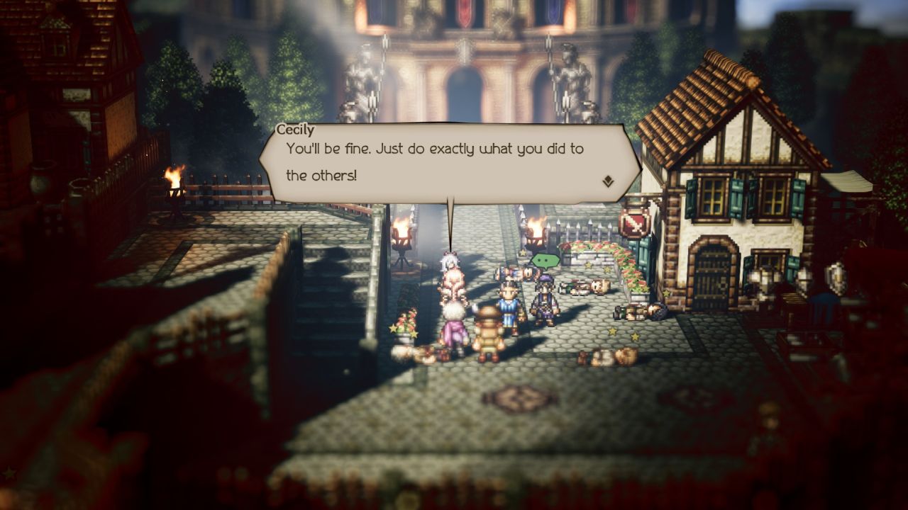 H'aanit had already knocked out everyone in town and their dazed bodies lying on the ground persisted into the cut scenes during Olberic story sequence. I actually laughed out loud when I saw this message: "Just do exactly what you did to the others!" Sure thing, Cecily!