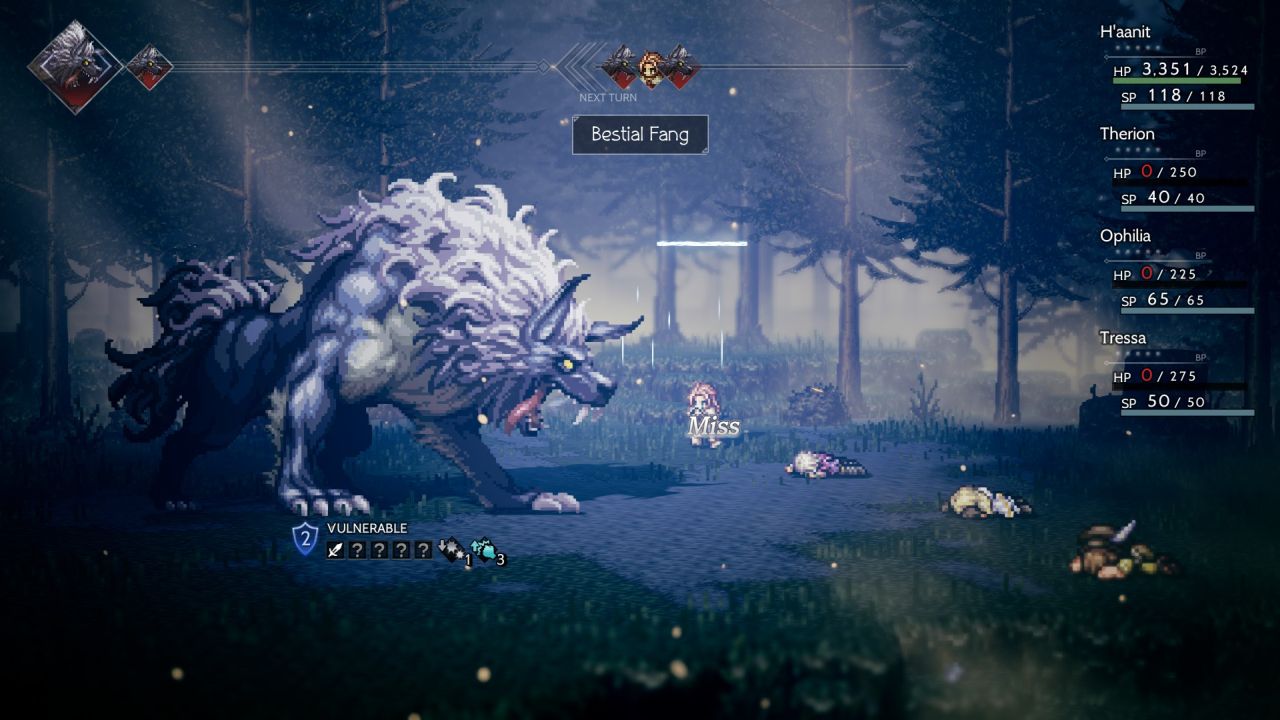 That's the graphical display when the Hunter Divine skill is activated, looking like a giant arrow getting called down from the sky right followed by a huge explosion and then the damage numbers printing out. H'aanit herself also looks strikingly like a catgirl in this picture, which I guess the Octopath Traveler developers liked enough that they just straight up made the Hunter in Octopath Traveler 2 into a catgirl (Ochette says hello). Anyway, I needed to have H'aanit spam-cast Draefendi's Rage throughout Cyrus' Chapter 2 story because the Sewers dungeon was legitimately dangerous. It was full of Marionette Bones and Puppet Bones that could inflict terror status combined together with Thunder Wisps and Wind Wisps that liked to fire off elemental surges. Each wisp spellcast was hitting for roughly 300 damage, and with three of them per encounter, that was about 1000 damage inflicted each round. Since none of these foes were weak against axes or bows, there was no way to break them aside from using monster captures, and therefore I fell back on killing everything with Draefendi over and over again. It was the only safe way to make progress even as H'aanit had to keep consuming more Inspiriting Plums for SP restoration after each fight.