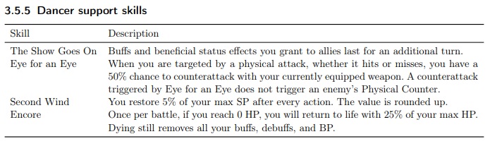 The initial support skill was The Show Goes On, granting an additional turn of application for friendly buffs. This was a pretty big deal for an entry-level support skill as it took the base duration of Primrose's buffing abilities from 2 turns up to 3 turns. That extra turn gave her enough time to buff herself with Peacock Strut, then break an opponent, then hit with a dark element skill before the buff wore off. This would not have been possible otherwise without boosting Peacock Strut. Later on, Primrose would unlock three additional support skills that each offered a sizable advantage. In fact these support skills were all great, very much unlike the duds that litter some of the other jobs. I'll discuss them individually in the report as they unlock since they were each significant in their own right.