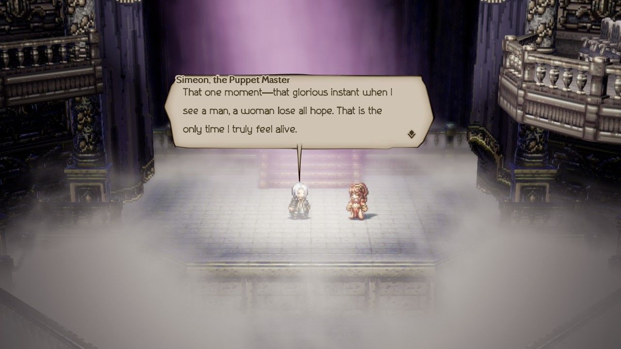 Out of nowhere, Primrose has an emotional breakdown in response to Simeon's speech. I cannot put in words how much I hate this writing that suddenly turns Primrose into a delicate emotional flower in a way that we've never seen at any point in time previously. Simeon is spouting obvious bullshit here and it's completely out of character for the Primrose we've seen throughout the game to fall apart at the last minute here. It's true that we don't know enough about Primrose's father to have any idea about what he would or wouldn't have wanted her to do so it's not possible to state definitively that Simeon is lying (though it certainly feels that he's not being honest). However, Simeon murdered Primrose's beloved family a decade earlier and then literally STABBED HER at the end of the previous chapter. Why would she listen to anything that he has to say, especially about her father?! I could understand that reaction from kind-hearted Ophilia who sees the best in everyone but it makes no sense from the Primrose we've been with the whole game. And sure, she gets over this moment of weakness soon enough and we hear again that faith will be her shield but it never should have happened in the first place. This is "Game of Thrones Season Eight" quality of poor writing here - Primrose again deserved better.