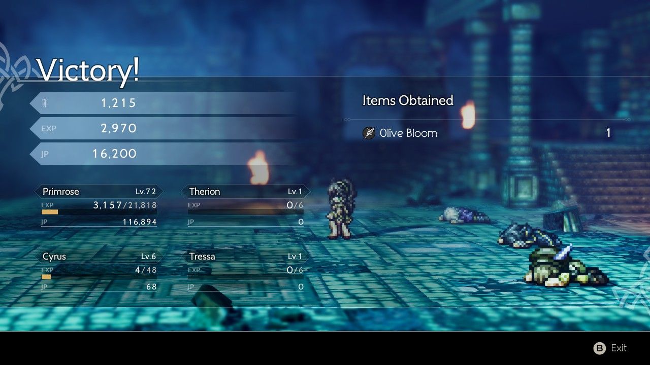 With this boss duel very much a battle against the clock, I was aggressive in using Refreshing Jams to keep up Primrose's health and enable more rounds of offense. Z'aanta was able to secure the second shield break and kick in additional damage to complement Primrose's own attacks with the Battle-tested Dagger. This was a slugfest though as Esmeralda kept using Red/Blue/Violet Blade repeatedly and I had to keep pausing to heal. I don't remember her using those blades quite so often with other characters, maybe Primrose had bad luck here. I was able to fight to a victory eventually after a sloppy, dangerous boss battle that saw Primrose get wiped out several times. She went through a full dozen Refreshing Jams on the winning attempt, argh! I still don't see a way to have defeated this boss more cleanly given the tools that Primrose had on hand. There's no easy trick here as with some of the other story-based opponents.