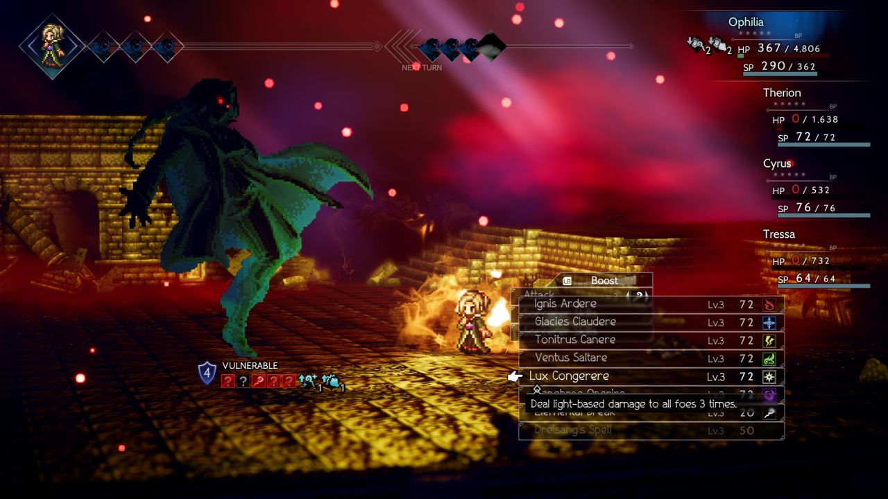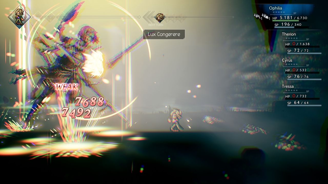 That's the victorious Lux Congerere landing above, you can tell that Ophilia has won because Winnehild's portrait has grayed out on the turn order at the top of the screen. This was a tough, tough boss to defeat that required a lot of luck factors to work in my favor, both in terms of dodging incoming attacks and also having the turn order play out correctly. I'd like to say that I had some incredible strategy at work here but much of it really did come down to "go crazy with Revitalizing Jams and pray that Ophilia dodges these attacks." In any case, it did work and she finished off another of the game's toughest opponents.