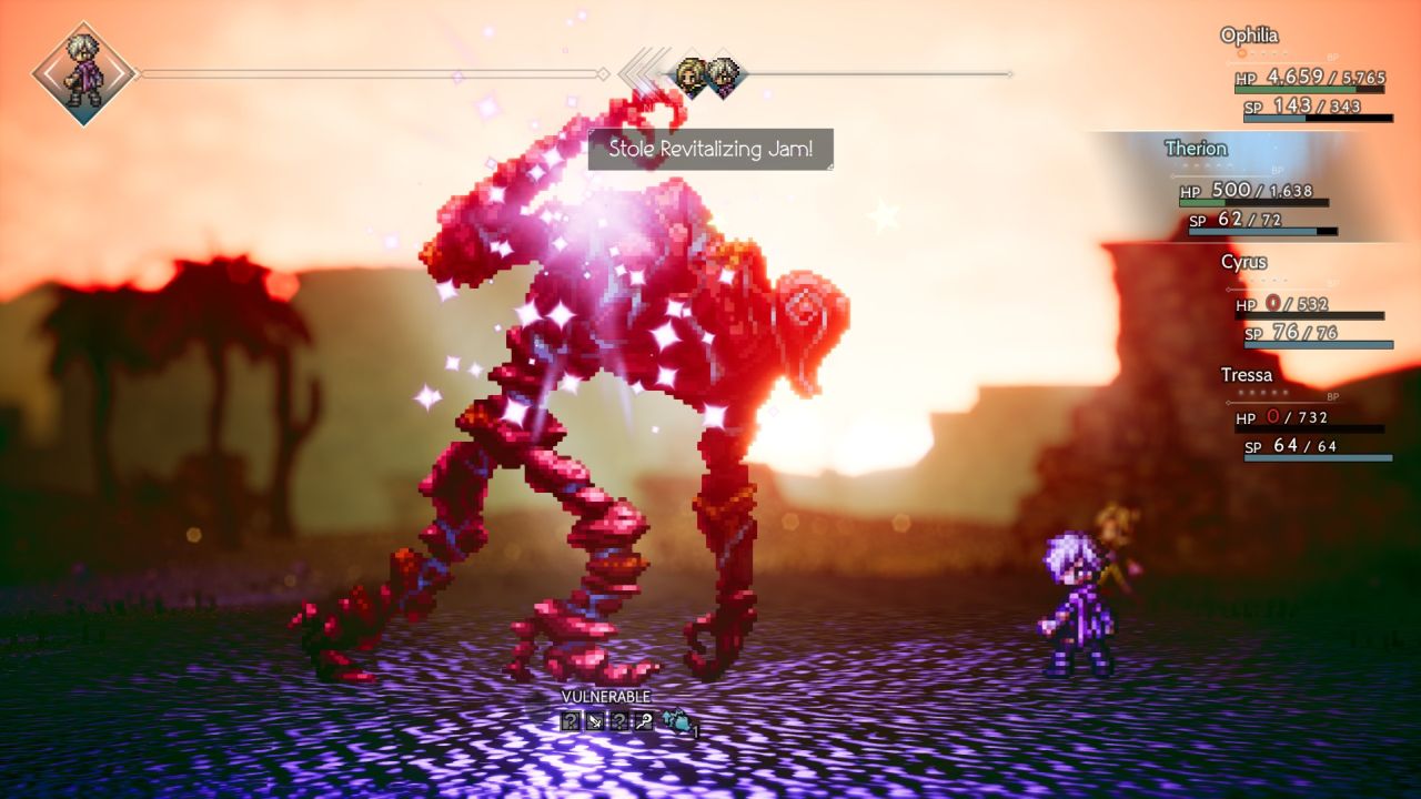 Defeating the guardians of the secret job shrines had the side effect of draining Ophilia's stash of recovery items. In particular, she was down to a mere five Revitalizing Jams from a starting point of a dozen going into those boss encounters. I needed to restock before proceeding any further and the only place to get these ultra-rare items is from a Steal against the Revenant monsters along the Grimsand Path. These monsters are supposedly also found in Dragonsong Fane and the Forest of Purgation but I've had much better odds to come across them in the desert where they appear to be roughly a 1 in 16 encounter. I had earlier taken the time to get enough job points on Therion to unlock his Snatch passive support skill which doubles the quantity of whatever he's stealing. This meant that each successful Steal against a Revenant would grant two Revitalizing Jams and speed up the process of doing this grind. It took about 20 minutes running the gameplay at my normal triple speed to add an additional nine Revitalizing Jams and get back to 14 total (4 x 2 Steals plus another Revitalizing Jam dropping as a post-battle reward from one Revenant). Along with about 50 Refreshing Jams and maxed out quantities of all the buyable recovery items, Ophilia had everything that she needed on hand.