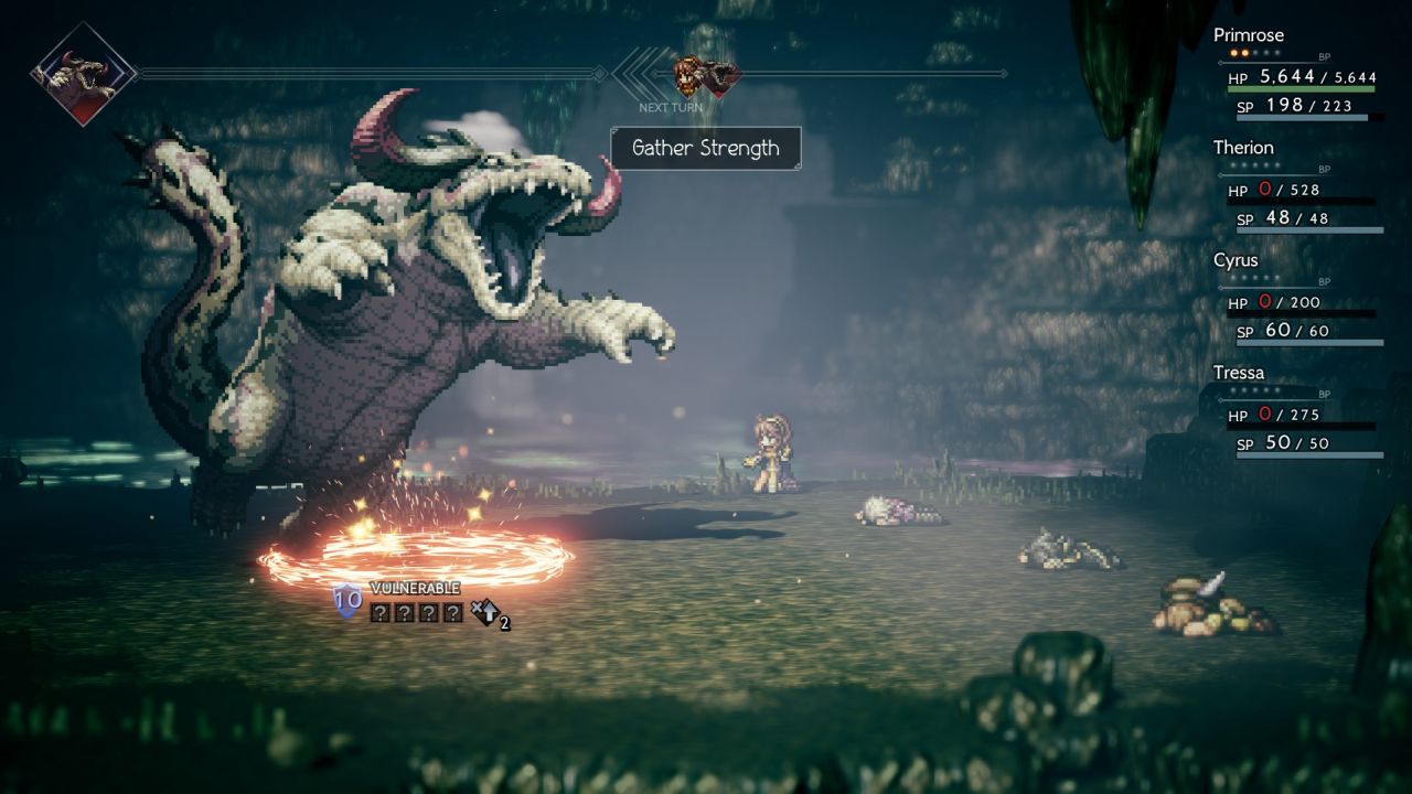 For the Gigantes miniboss in the Refuge Ruins, I did know the timing of its attack buff: it always uses Gather Strength on the first round of the fight. Thus I had Primrose block this with a casting of Celestial Intervention on the first turn, which prompted Gigantes to waste its turn with a useless ability when it acted. Gigantes kept right on casting Gather Strength each turn and I might have been able to tie it up in useless circles by repeatedly casting Celestial Intervention; apparently its AI scripting is to use this ability any turn that it doesn't have its attack buffed. Instead, I swapped over to attacking with Shooting Stars and dodged the one big Charge attack launched by the beast, then defeated it before Gigantes could make a second attack. This resulted in a perfect no-damage-taken miniboss fight for the "Untouched" 10% bonus to money, hah!