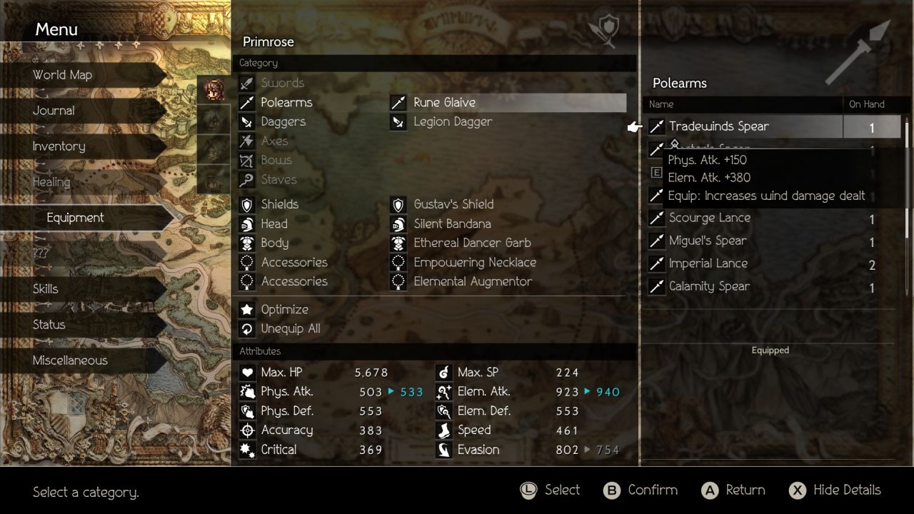 It was a hard-fought victory and required eight Refreshing Jams (due to the slow process of whittling down Esmeralda with a bunch of Steorra's Prophecy castings) along with that Revitalizing Jam at the end. Nevertheless, this obstacle was out of the way now and I could claim the spoils of war: a new weapon called the Tradewinds Spear. This is the weapon with the highest elemental attack in either the spears or the daggers slot and therefore the best weapon that the Starseer can equip from a numbers perspective. It also has the property of increasing wind element damage by 30% (not that Octopath Traveler's terrible in-game interface ever details the exact amount) which would help out the first third of Shooting Stars' damage. The Esmeralda battle had highlighted the biggest weakness of the Starseer class: poor shield breaking abilities. It sounds good to hit with three different elements at once, but it practice it's actually a lot better to hit three times with the same element!