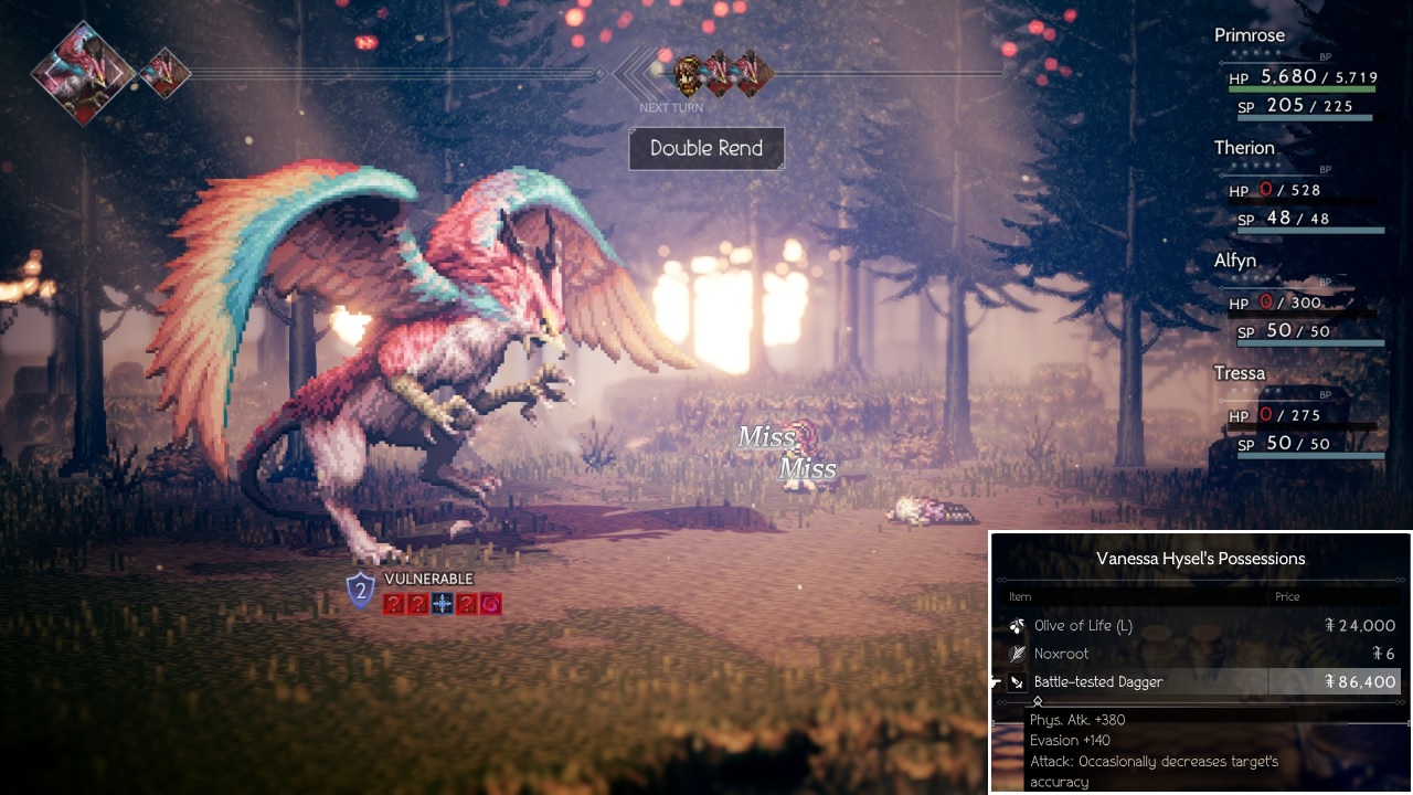 The prize for winning was an opportunity to Purchase the Battle-tested Dagger from Vanessa Hysel at the back corner of the Undertow Cave. This weapon only had 11 more points of evasion as compared with the Legion Dagger that Primrose was already using; still, an upgrade was an upgrade after all. If Primrose ever needed to use her physical attack, the 380 points of physical damage and chance to debuff the accuracy of the enemy would come in handy. And speaking of that, she would need to use her physical attack at times against her next opponent: