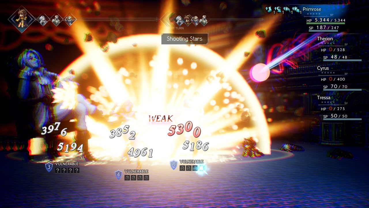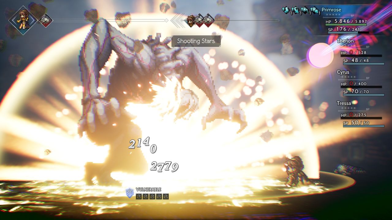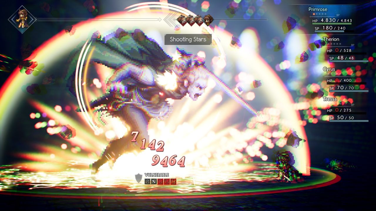 So the whole issue in the Darius fight came down to avoiding his "Call Comrade" move once again, which he will trigger upon dropping below 1/4 health remaining. My goal was to work Darius down to roughly 30% of his lifebar, set him up for a shield break on demand, and then wait until Primrose would be the first one to act on the following turn. It's much easier to type this out in theory than pull it off in practice, of course, as Darius would be attacking Primrose the whole time while she had to juggle her health, her spirit points and boost points, keep the Starsong buff in place if at all possible, and ensure that she still had access to her items as needed. If Darius took her items away but the setup wasn't quite right to make it past Call Comrade, I would have no choice but to break Darius and then work through all of his shields once again for another attempt. The first time that I tried this battle, I did slightly more damage to Darius than I expected and blew past his 1/4 health mark for an immediate Call Comrade death, hmmpf. Even though I had a spreadsheet out and was tracking his HP total throughout the fight, Primrose did slightly more damage than I wanted with Shooting Stars and overshot the target number.