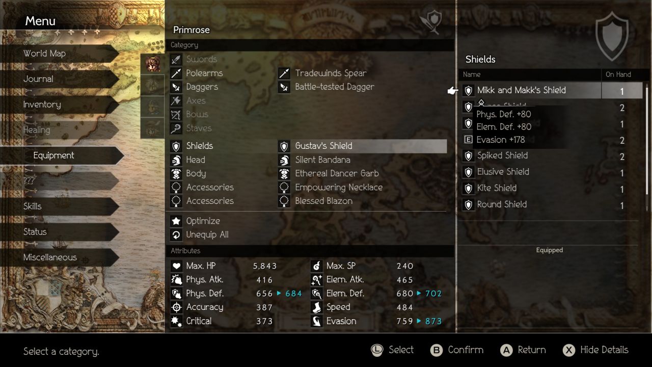 Darius tends to be the hardest of the Chapter 4 bosses but then also provides what's likely the single best reward for defeating him. This is Mikk and Makk's Shield which is easily obtained via a side quest in Noblecourt, requiring only that Tressa and Therion both have their storylines completed ahead of time. Mikk and Makk's Shield was far superior to the ancient Gustav's Shield that Primrose had been using for most of the game's duration, with modest boosts to physical and elemental defense and then a whopping increase of 104 more points of evasion. When combined together with the evasion on the Battle-tested Dagger, Primrose had now maxed out the evasion stat at the cap of 999. Starsong supposedly increases this by another 50% when used in battle and I really wonder how this is coded behind the scenes. I can attest that Primrose definitely dodged more attacks when Starsong was in effect so clearly the extra evasion does get applied in some fashion. The other new equipment that unlocked was an accessory named the Blessed Blazon that adds 100 physical and elemental defense; while it wasn't anywhere near as useful as Mikk and Makk's Shield, it was still a nice additional to Primrose's bag of goodies.
