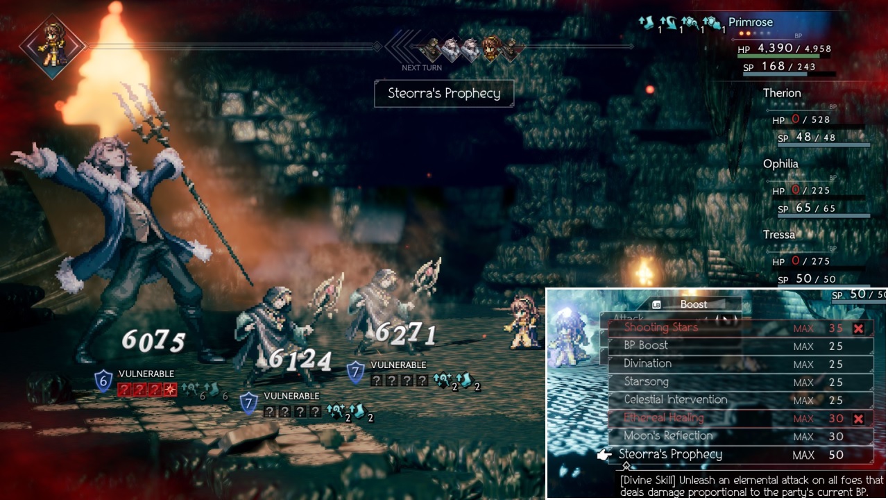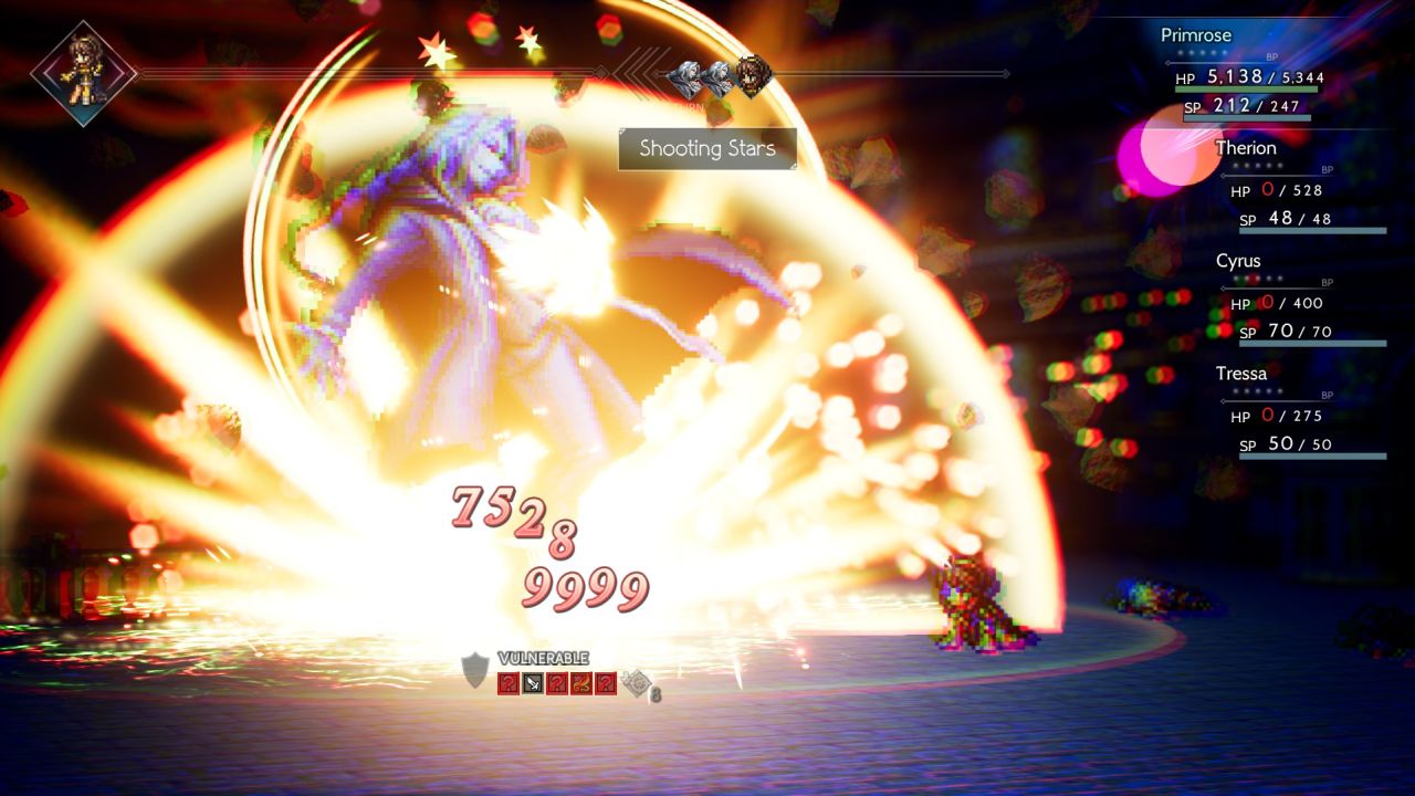 The second Simeon fight is also quite easy until the boss drops under 50% health remaining, at which time he goes up to three actions per round and starts spamming his Act of Impulse move. Simeon has an unusual weakness pattern whereby he starts with only daggers unblocked, then slowly unblocks more weaknesses after recovering from each shield break. Most of my solo characters have no chance to break him at all, lacking daggers as a damage option, but I could hit that weakness here as Primrose broke out her rare auto attacks. I smacked Simeon with a max boosted Shooting Stars when he was broken, getting my first 9999 damage printout of the run in the process, and the dagger attacks even debuffed Simeon's accuracy stat in the process. Simeon then changed his weaknesses so that only swords and fire element were exposed, prompting me to use a series of Fire Soulstones to carve away at those shield protections. I eventually broke him a second time, hit with another max boosted Shooting Stars, and that dropped Simeon low enough on health for the second half of the battle to begin: