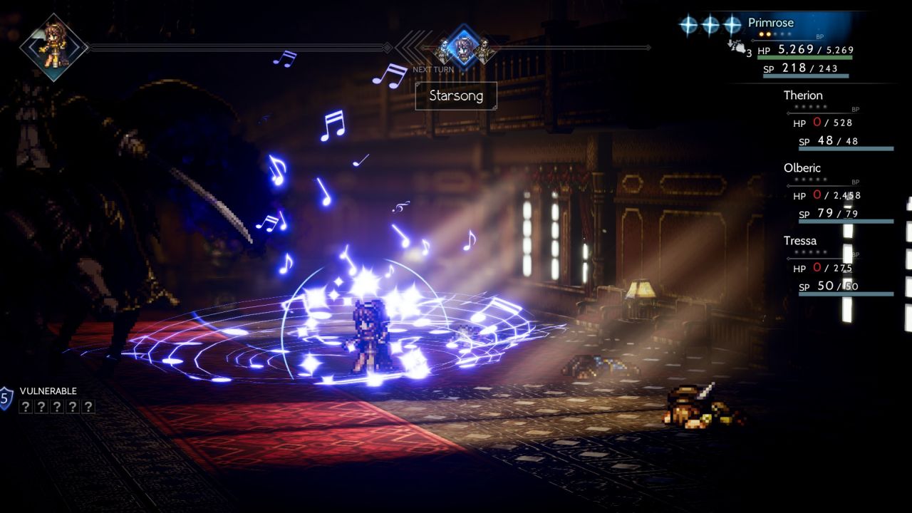 Yes, it was time to get the dreaded Darius fight out of the way. Anyone reading this has probably already seen my other Octopath Traveler reports, but as a quick refresher Darius will steal away the party's items at various points in time and must be broken to get them back. He also has the infamous "Call Comrade" instakill cheese move that results in an immediate gameover if he isn't broken immediately at the start of the next turn. Many solo classes either don't have an answer to these boss abilities or have to contort themselves into pretzels to find a path through them. I thought that the Starseer class would be a good fit for Darius, however: Primrose could use Starsong to cancel out the Nighthawk physical defense debuff used by Darius, while her incredible evasion would allow her to dodge most of Darius' Steal HP/SP/BP moves. Most importantly though, the Starseer class has access to daggers as a weapon type which is the only weakness that Darius never locks out during the battle. It's critically important to be able to break Darius' shields at precise timings and the Starseer would be totally lost here if it didn't have access to daggers. This was therefore the rare case where the class genuinely did need its physical attacks and couldn't rely solely on spellcasting.