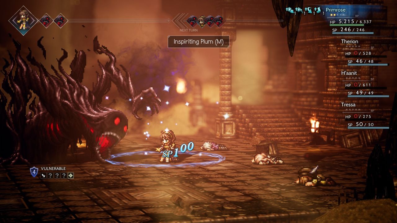 The Lord of the Sands in the Marsalim Catacombs was much the same story, another optional side boss with about 20k health and a whole bunch of shields for protection. The Lord of the Sands was weak to spears so I could have punched through its protection with enough auto attacks, though that didn't feel worthwhile in this situation. It kept buffing its physical attack while Primrose countered with Starsong to buff her own physical defense and evade. I could have used Celestial Intervention to block the application of its buff, except that I rarely face this boss and didn't know the proper timing. Primrose had better luck at dodging attacks and getting Divine Aura to trigger and block damage while she brute-forced her way past another miniboss.