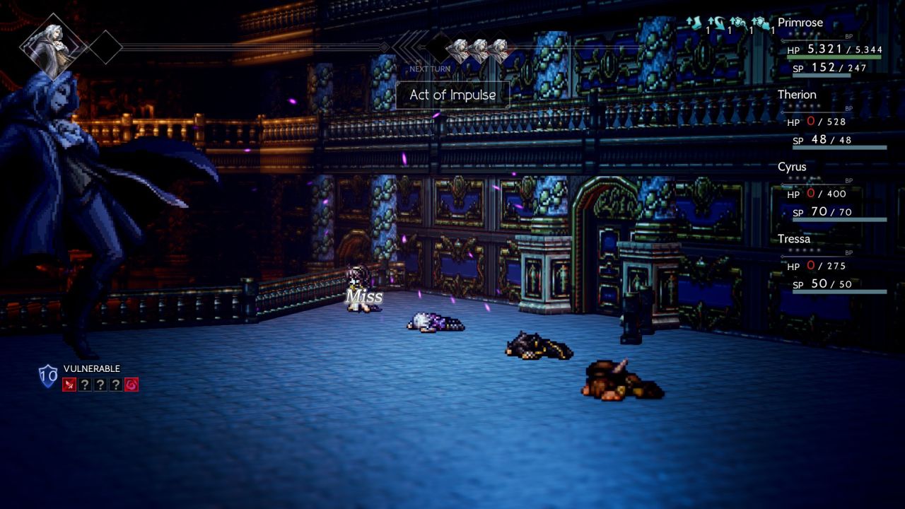 The danger in the battle comes from Simeon using his Act of Impulse attack which he will employ at least once per round, sometimes twice per round. As I had seen all throughout Primrose's journey, she was very good at dodging this ability and it only landed a couple of times, though when it did hit Act of Impulse was dealing nearly 2000 damage. I was making the battle harder on myself by refusing to use any Refreshing Jams as a sign of disrepect for Simeon. The need to keep pausing for Healing Grape and Inspiriting Plum use dragged things out a bit while Primrose also had to keep reapplying Starsong and only cast Shooting Stars when she had a safe window. It took a little while but I did pull this off successfully on the first attempt, with five total max boosted Shooting Stars finishing off the puppetmaster. Farewell Simeon.