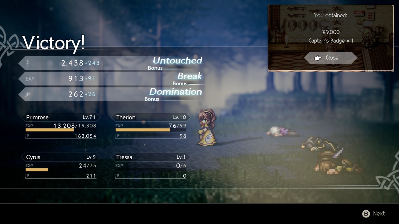 Completing all of the Chapter 4 stories unlocks a series of additional side quests, and while most of these are only situationally useful for characters, there was one quest reward that I had accidentally neglected for Primrose. That was the Captain's Badge accessory which grants +50% XP to the party so long as anyone has it equipped, requiring only that Ophilia and Olberic's stories have been completed. While Primrose was late enough in Octopath Traveler's gameplay that the boosted experience gain wouldn't make much of a difference, it was still better than anything else that she might choose to wear while clearing her way through random encounters. Those random fights had long since ceased to pose any challenge and therefore every non-boss encounter for the rest of the game would take place while wearing this thing. The Captain's Badge was enough to take a bunch of monster encounters up close to the 1000 XP threshold and led to fun screenshots like the one above.