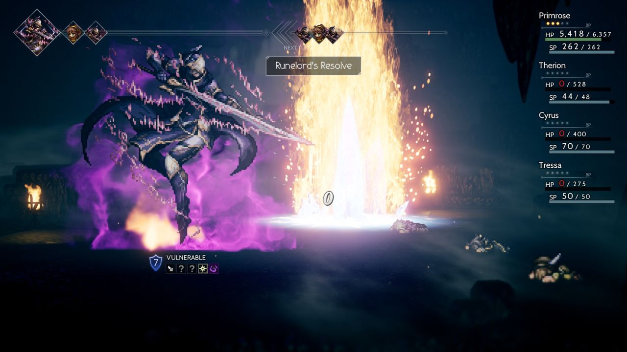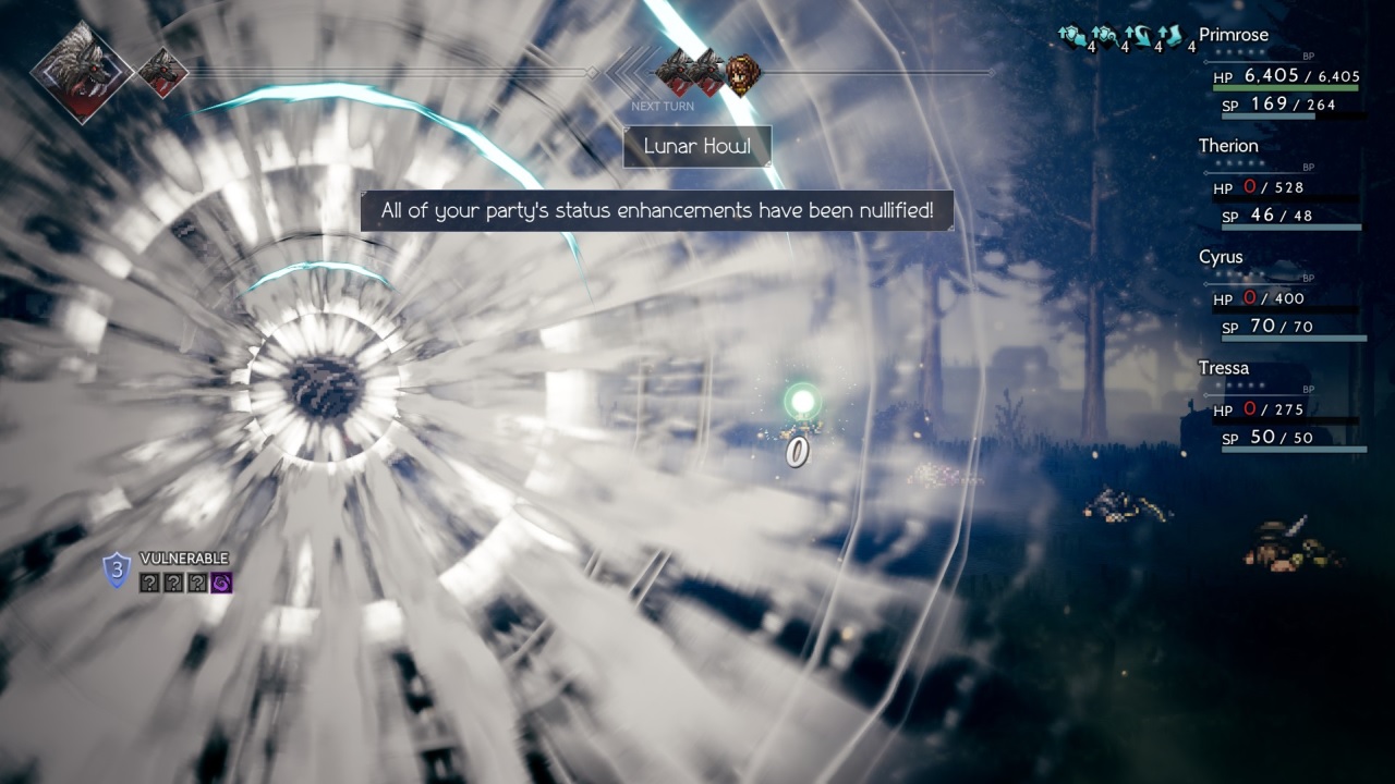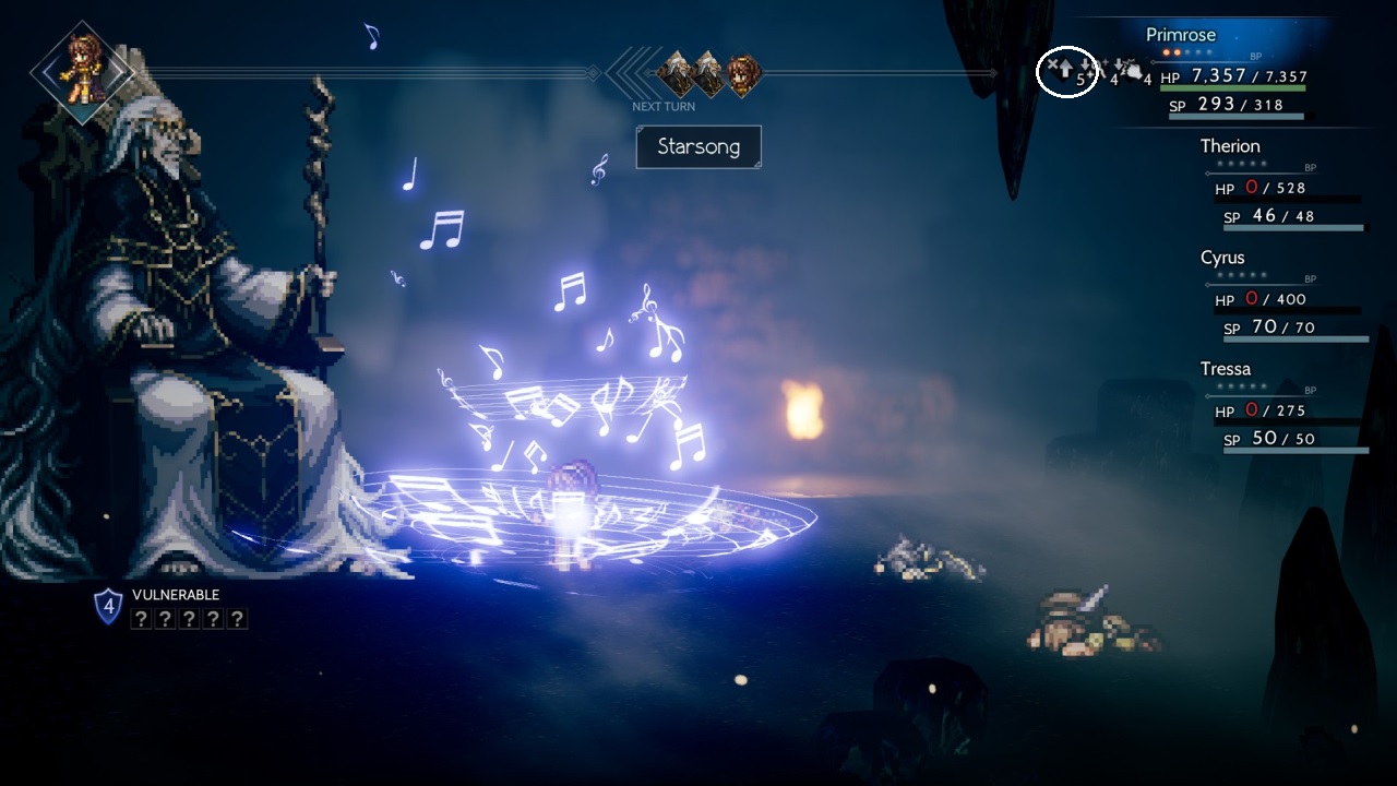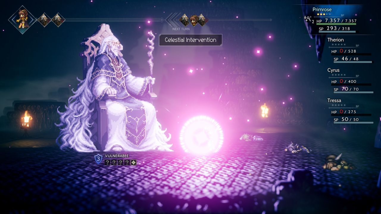 The solution was to have Primrose cast Celestial Intervention on herself before Dreisang could put Divine Majesty in place. With Celestial Intervention protection enabled, Divine Majesty simply was not applied and that allowed Primrose to apply her Starsong buff on subsequent turns which then provided the elemental defense needed to survive this fight. I quickly realized that Dreisang was highly predictable in this regard: he would cast Divine Majesty as his first action at the start of every fifth turn, without fail. By keeping track of which turn it was, I could ensure that Celestial Intervention was in place to block Divine Majesty whenever it popped up. While I couldn't avoid the initial Divine Majesty on the first turn of the boss fight, I managed to keep it from being applied over and over again thereafter. I slipped up once and let Divine Majesty through but only that single time which wasn't bad at all.